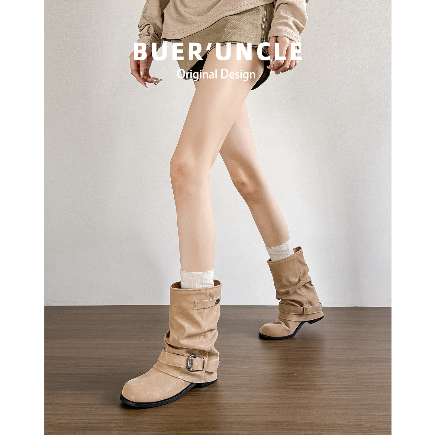 真皮!不二鞋坊内增高中筒靴秋冬新款褶皱堆堆裤管靴高筒骑士长靴