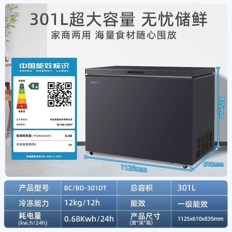 美菱冰柜家用大容量一级节能减霜冷藏冷冻两用小型冷柜超低温速冻