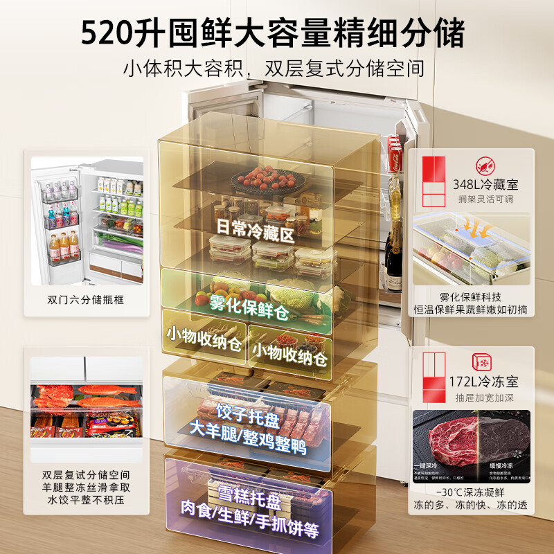 美的M60小机皇520超薄零嵌入式冰箱家用双系统法式多门四门双开