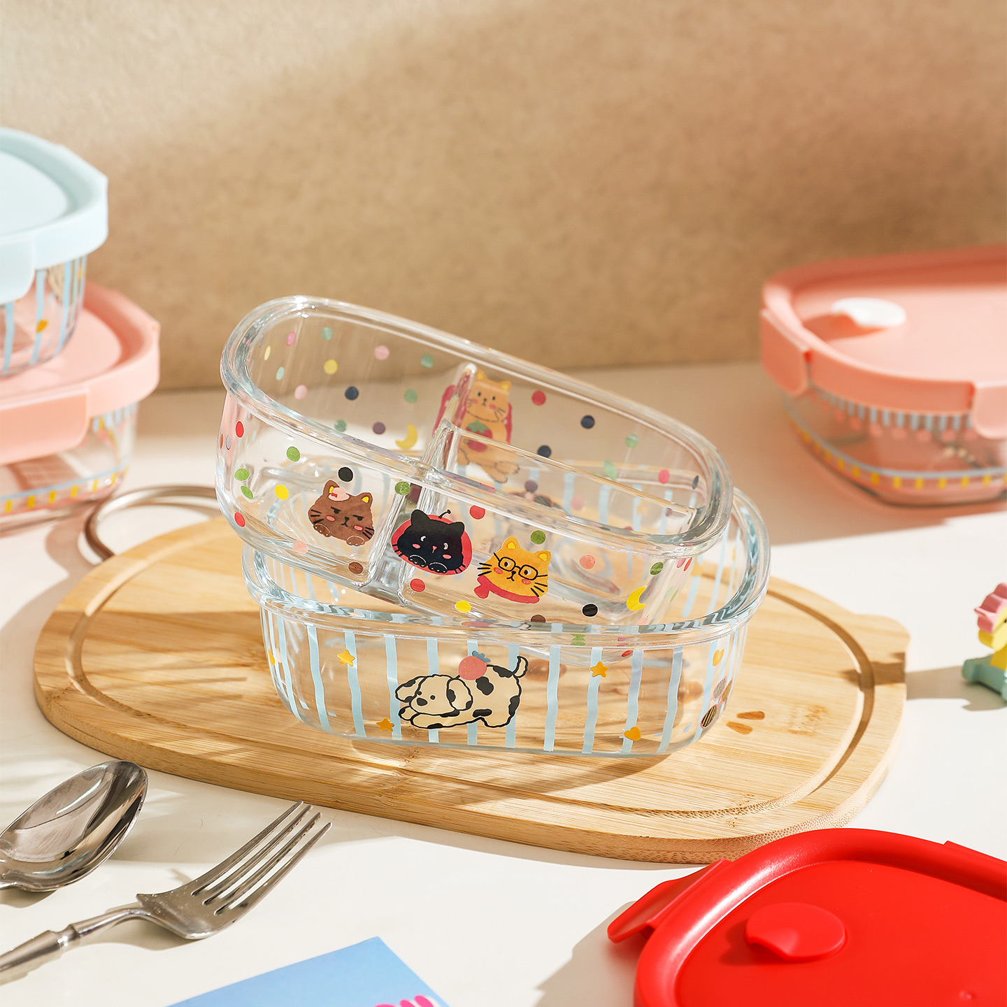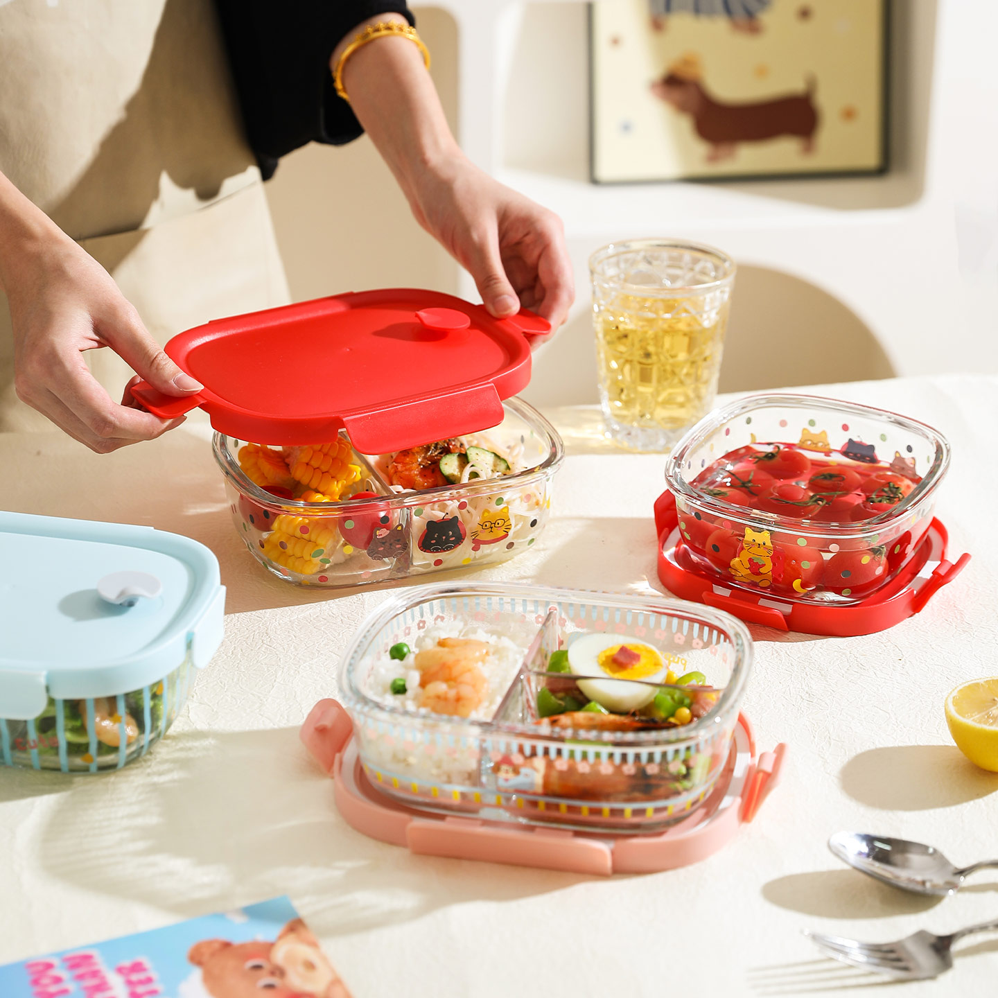 舍里卡通玻璃饭盒保鲜盒便当盒微波炉加热上班族带饭分隔密封餐盒
