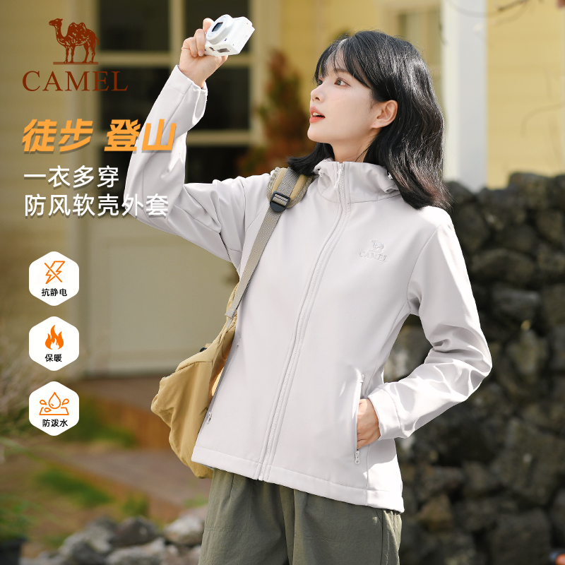 骆驼户外软壳衣外套男秋冬加绒加厚防风防水运动夹克连帽登山服女