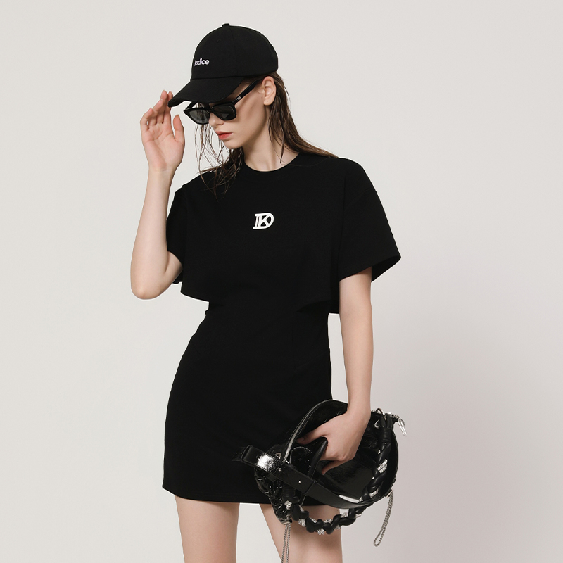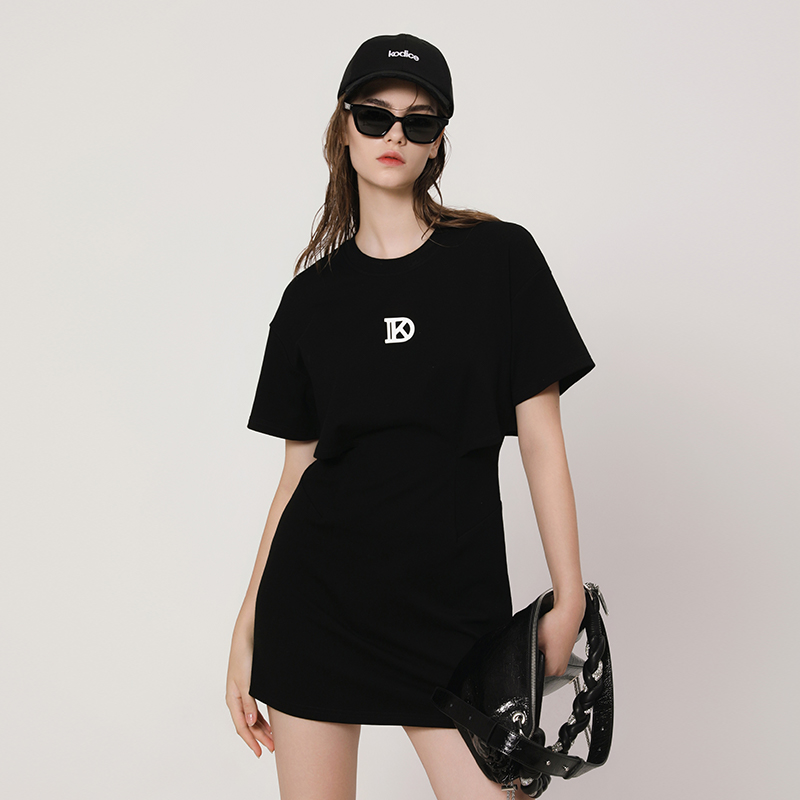 kodice春夏新款黑色棉质连衣裙子圆领刺绣短袖收腰时尚短裙女装