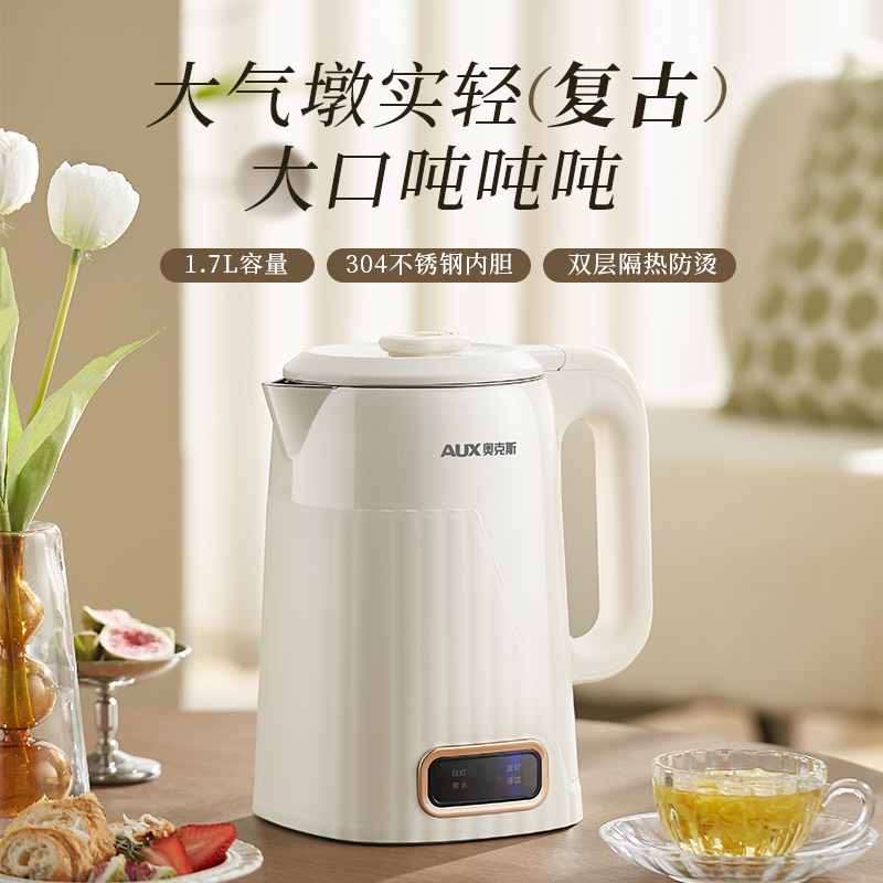 奥克斯1.7L电热水壶304食品级不锈钢保温一体烧水壶开水壶大容量