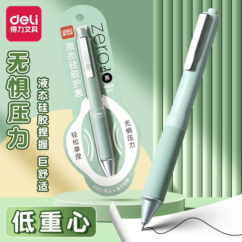 得力低重心液态硅胶护套速干中性笔按动0.5mmST头双球珠刷题笔考试专用高端签字笔初中生专用高颜值黑色笔