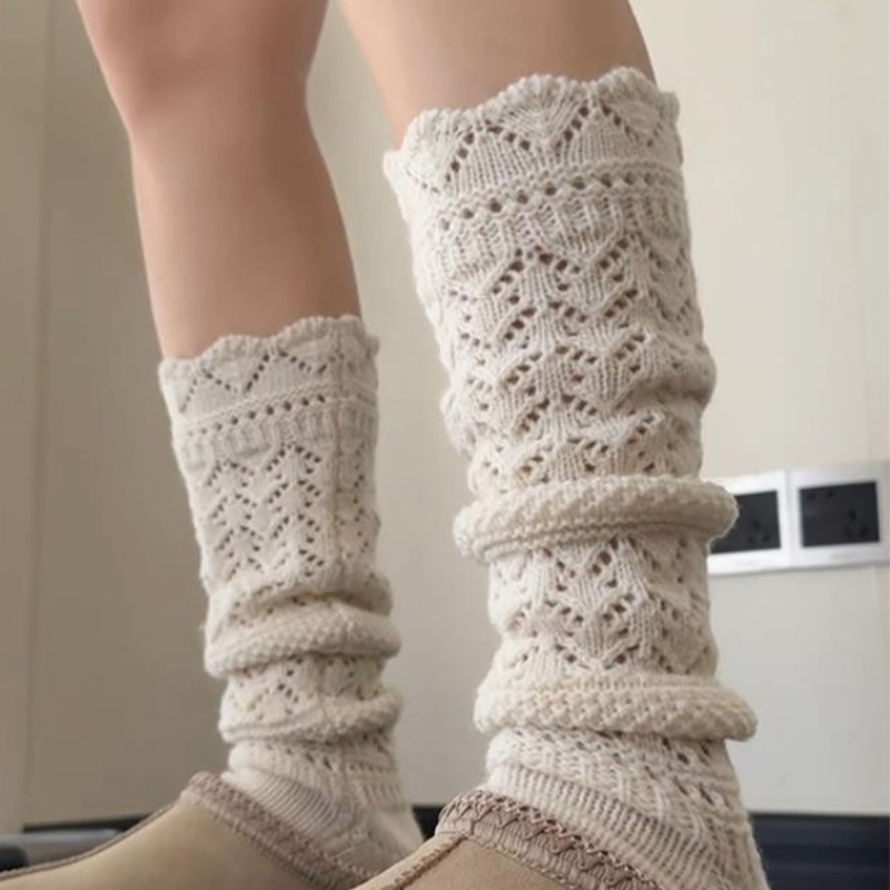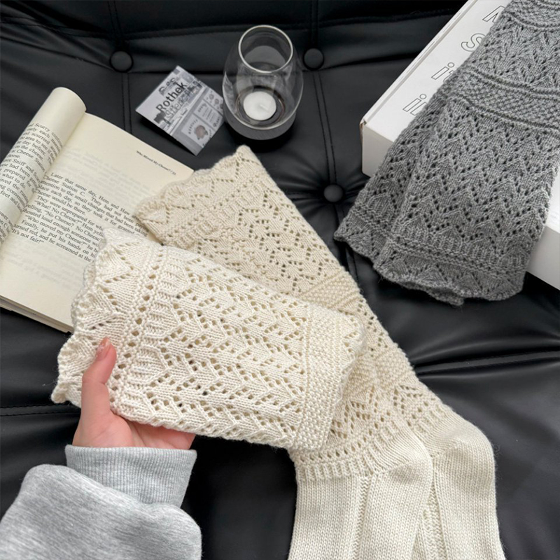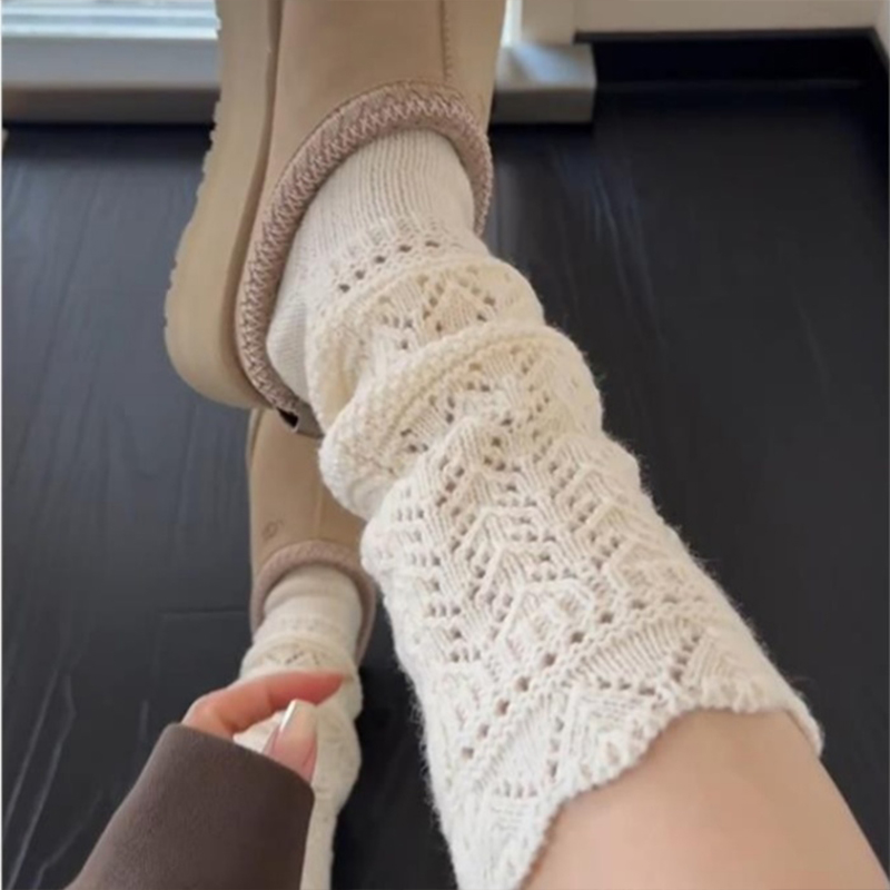 复古镂空粗针小腿袜子女ins潮秋冬堆堆袜羊毛袜还保暖中筒黑色