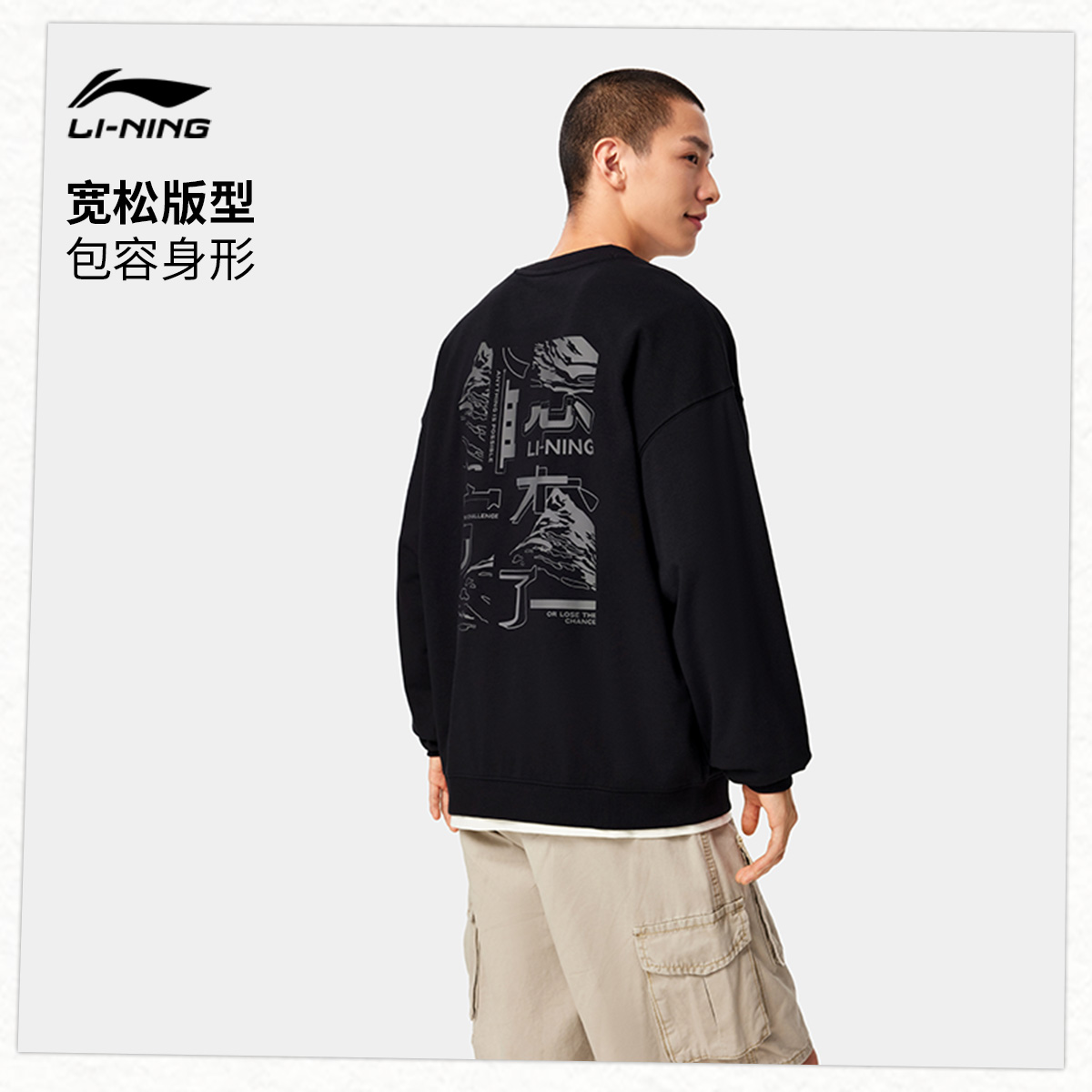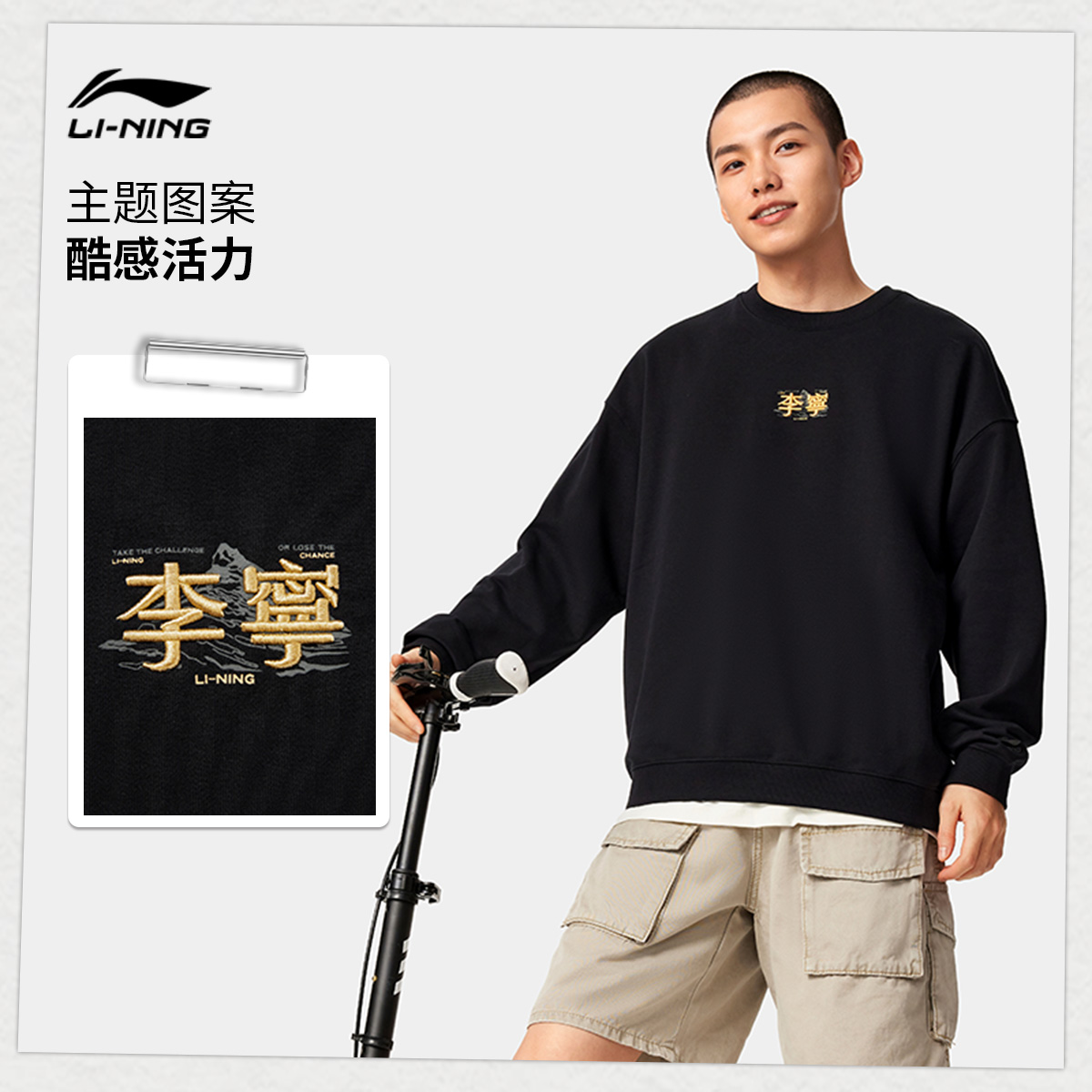 李宁卫衣男士秋季情侣圆领套头衫黑色宽松长袖针织上衣运动服女款