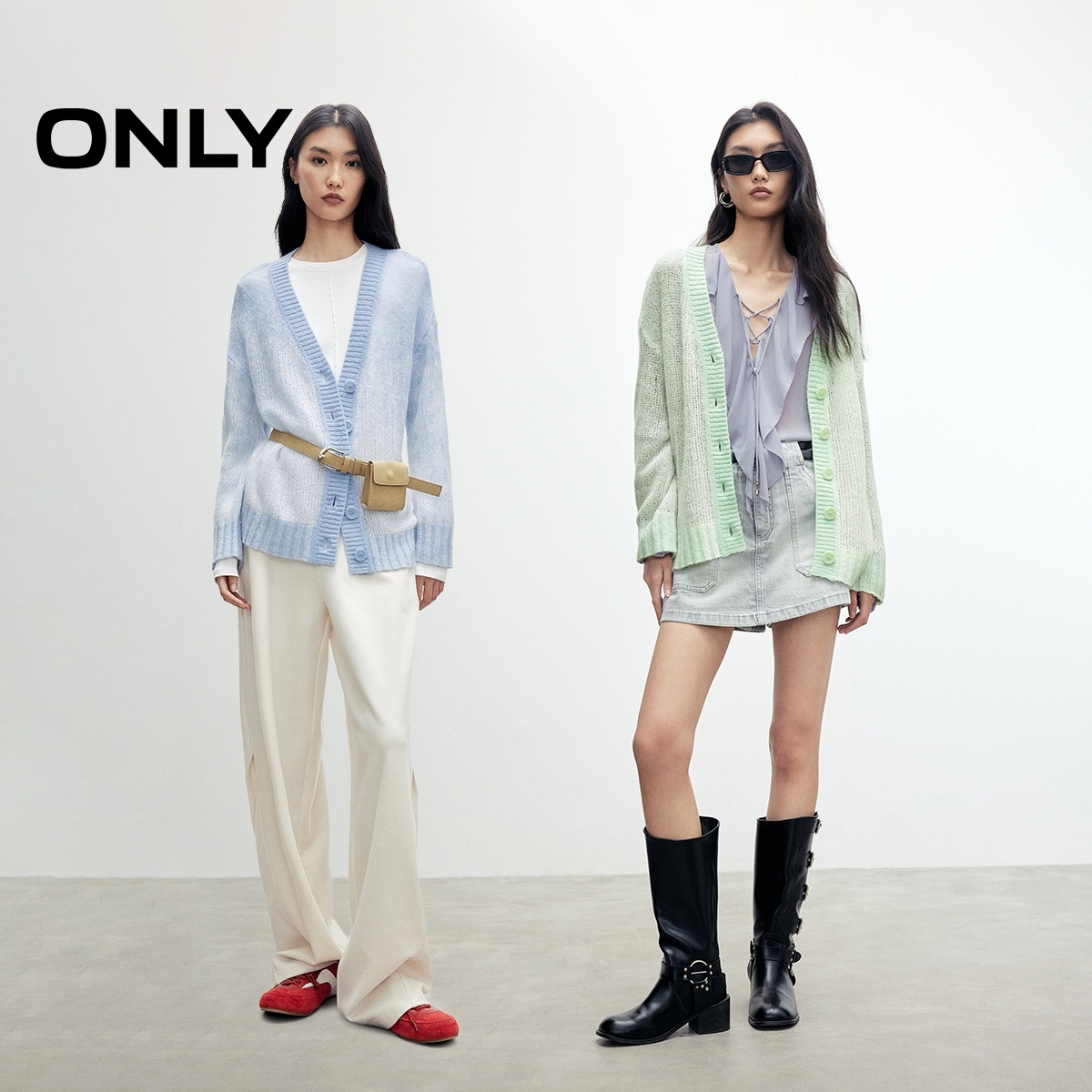 ONLY2025冬季新款空气感镂空设计天鹅颈V领落肩开衫针织衫女