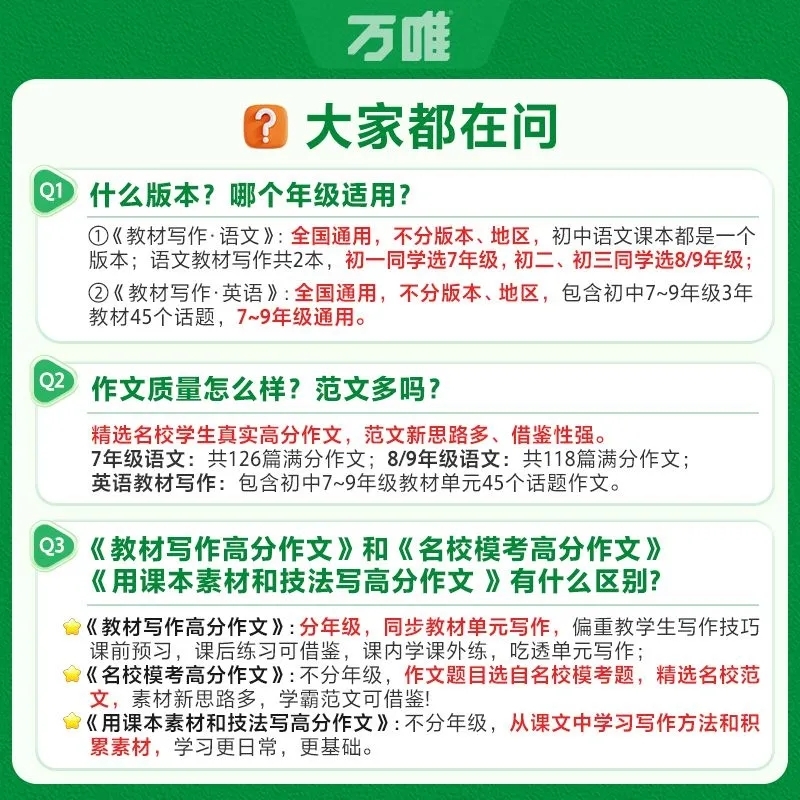 2026万唯七八九年级教材写作名校满分作文语文英语教材同步优秀高分范文写作素材大全万能模板789初一二三万维中考教育官方正版