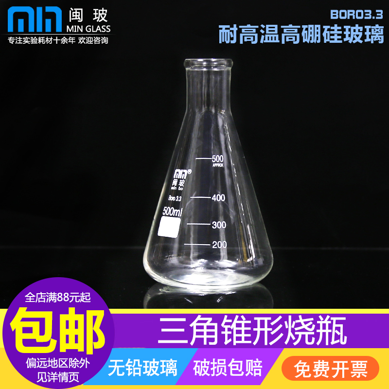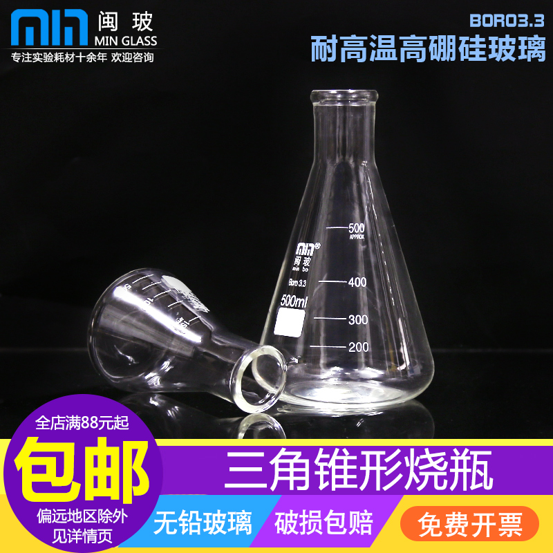 闽玻 三角烧瓶玻璃锥形瓶大B口直口锥形烧瓶高硼硅耐高温三角烧瓶25/50/100/250/500/1000/2000/3000/5000ml