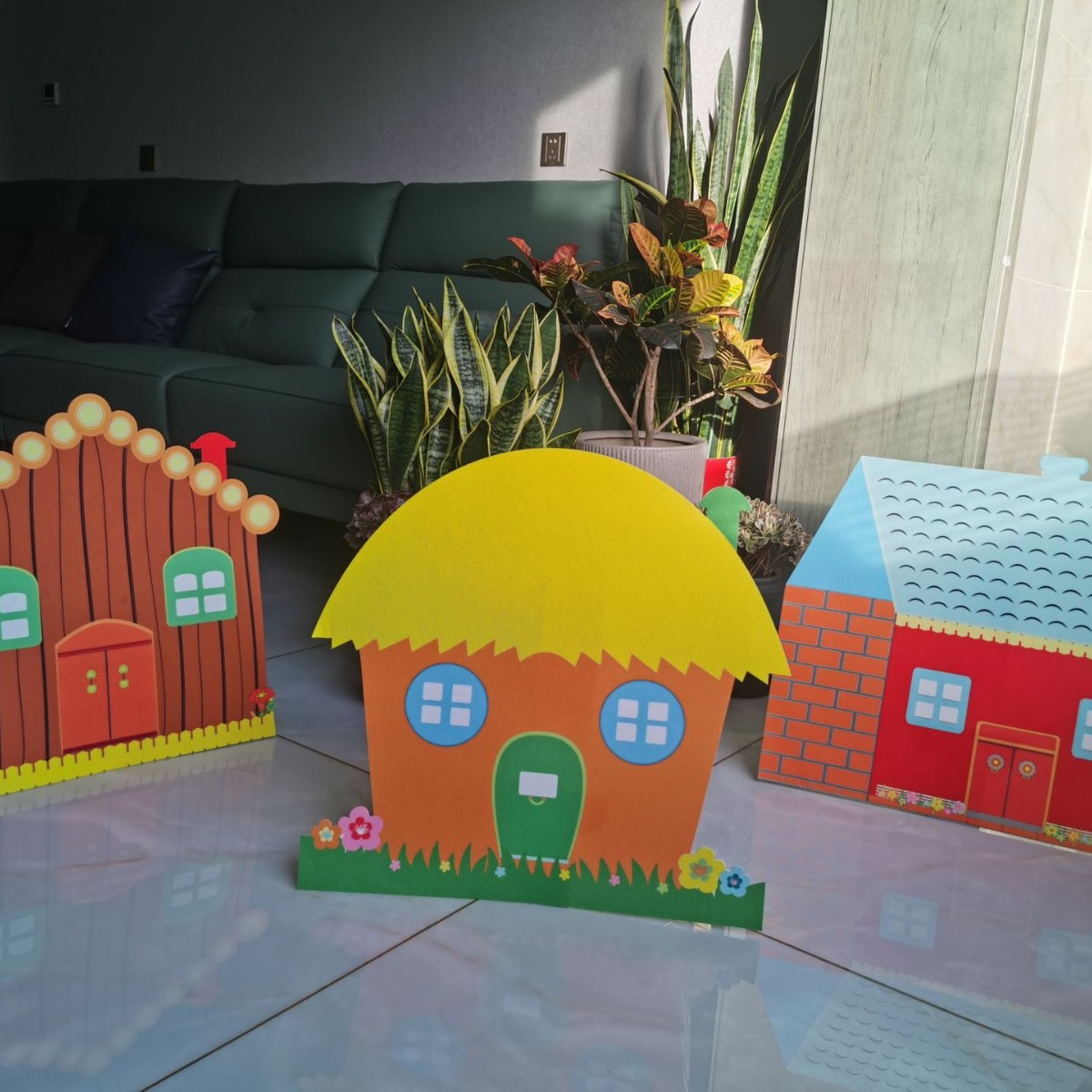 草木砖房子卡通道具舞台装饰效果假山水画六一儿童节舞台剧话剧