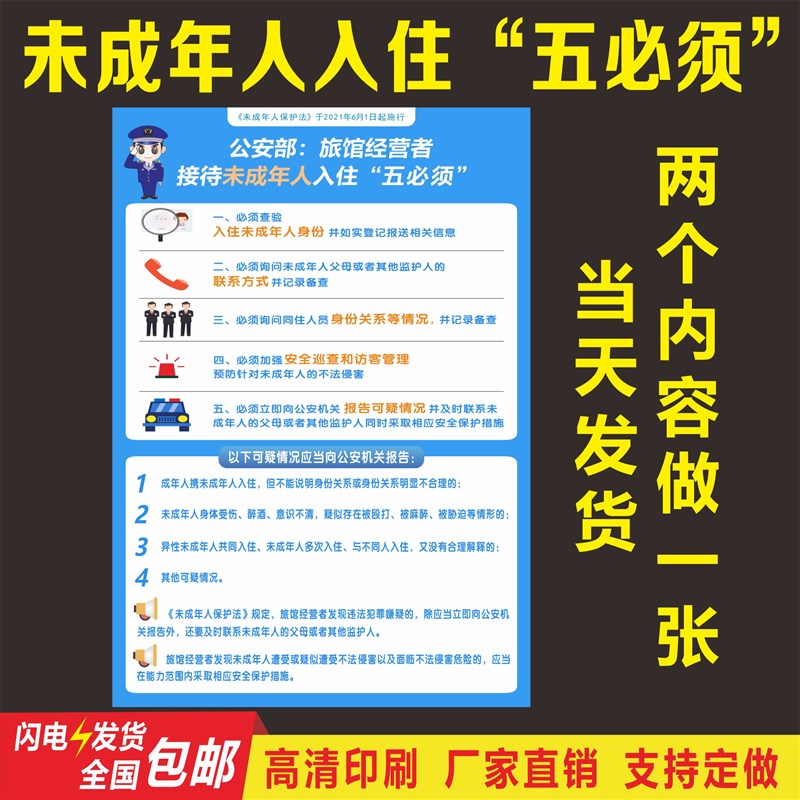 未成年人入住五必须m 旅馆宾馆接待未成年警示牌四实登记一人一证