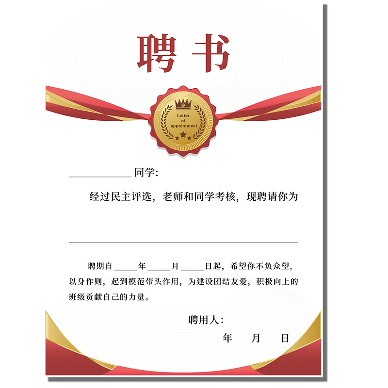 学生聘书班干部聘书班级班委聘书奖状定制委任状仪式感小学生聘书奖状制作班干部