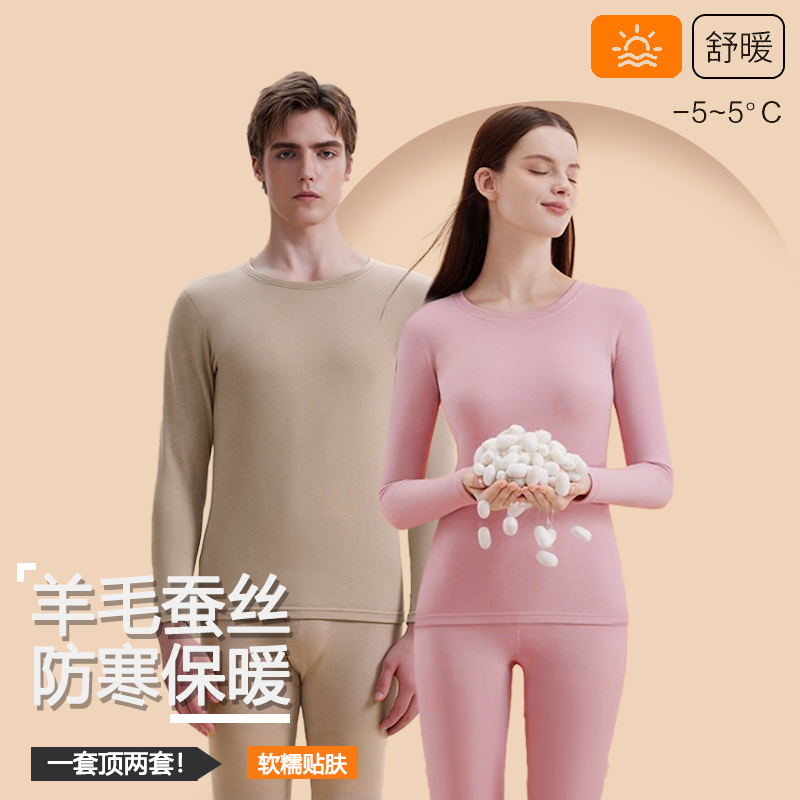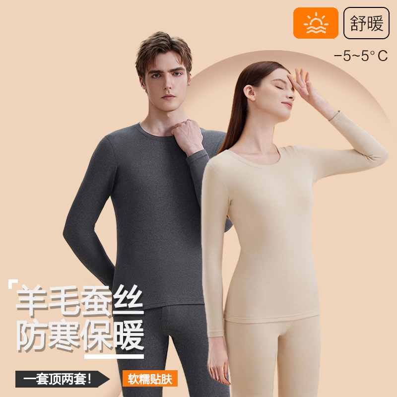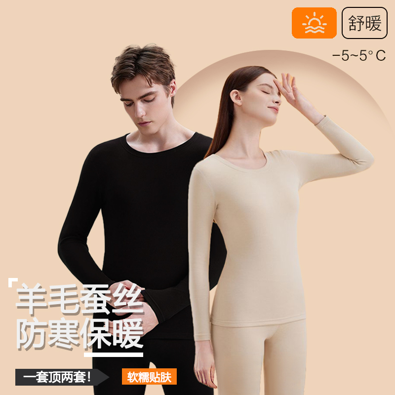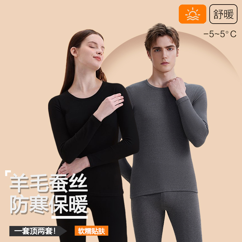 羊毛蚕丝保暖套装打底保暖衣女圆领情侣男士中领内衣防寒自由黑色