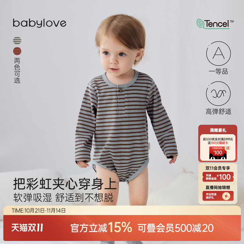 babylove婴儿包屁衣秋冬莫代尔棉宝宝三角哈衣爬服弹力条纹打底衣