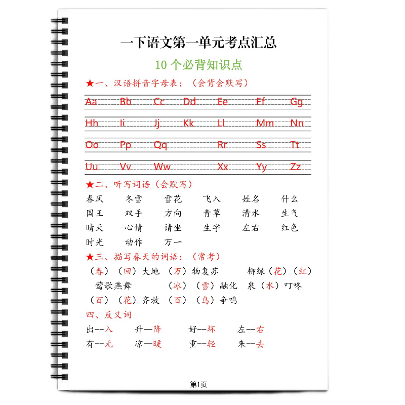 人教版小学语文一年级下册语文考点汇总答案+练习知识总结归类汇总复习课本重点内容知识点归纳期中期末复习常考知识归纳
