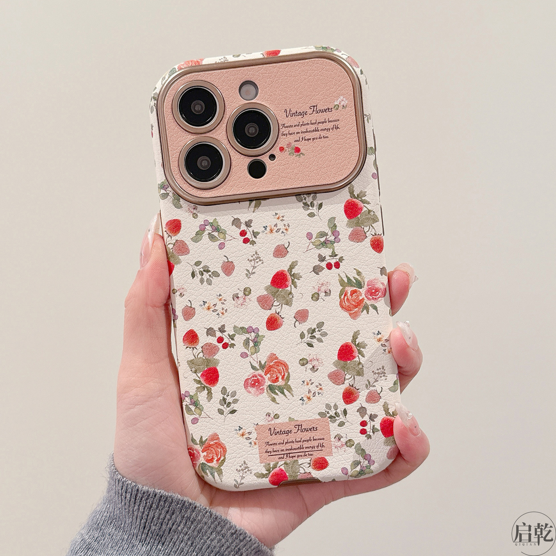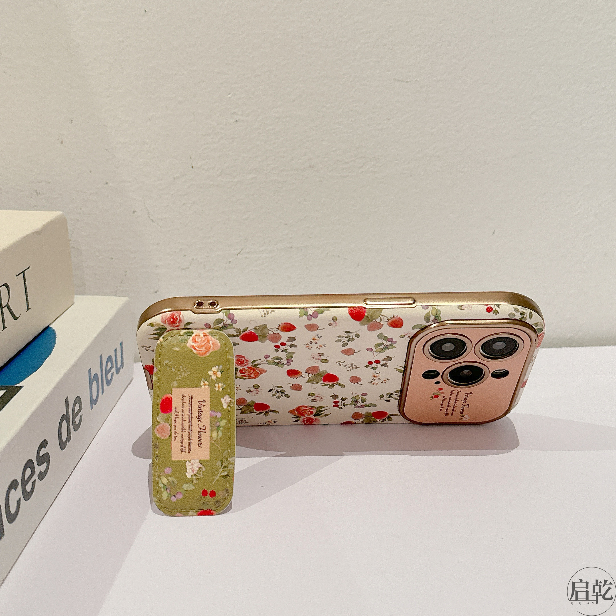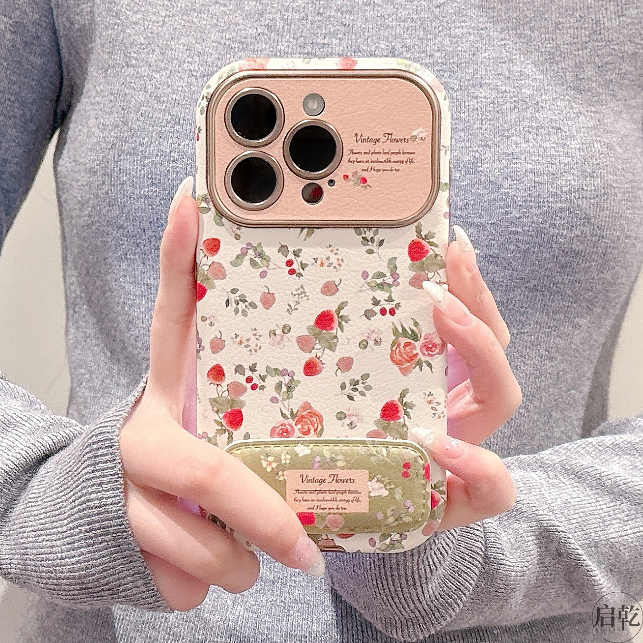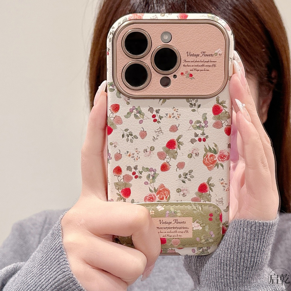 启乾 田园风草莓玫瑰折叠支架iPhone16/15手机壳适用苹果14/13promax皮质软壳小清新文艺花朵日韩新款秋冬女