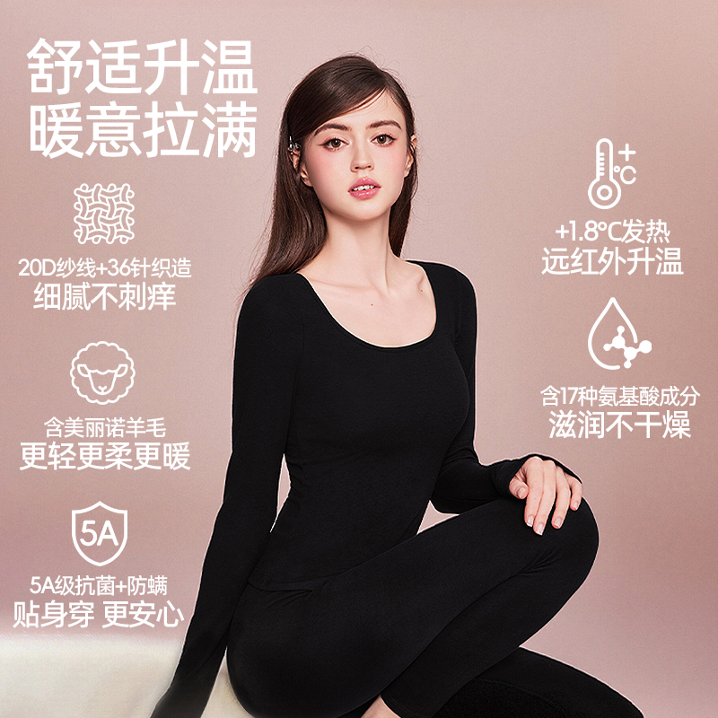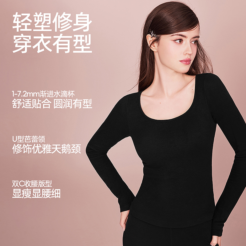 好奇蜜斯羊毛保暖内衣女发热莫代尔肌底衣秋冬内搭带胸垫加绒秋衣