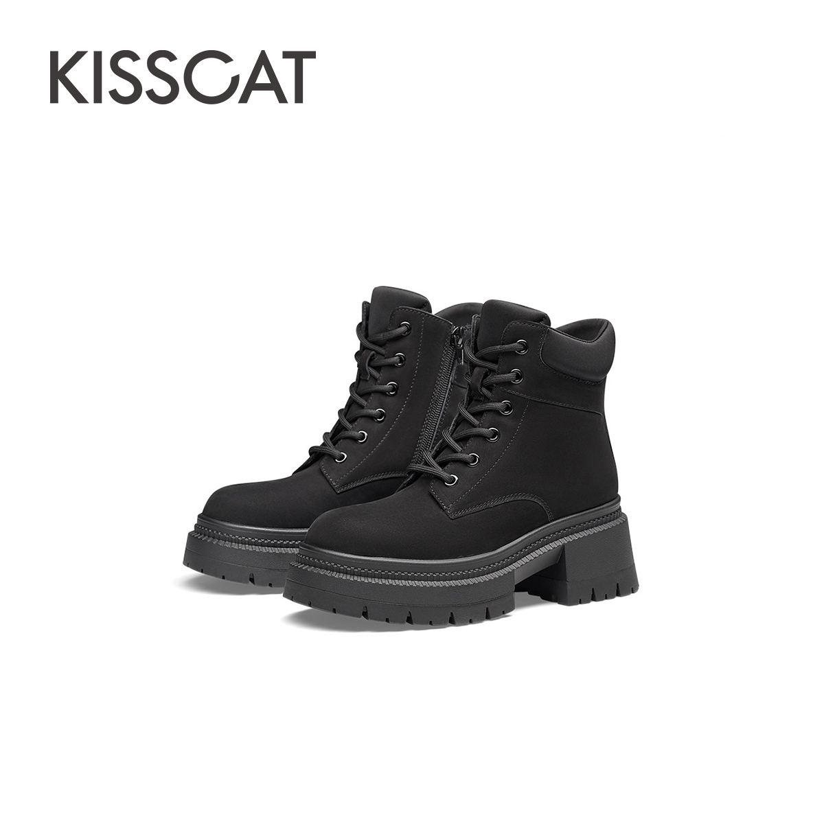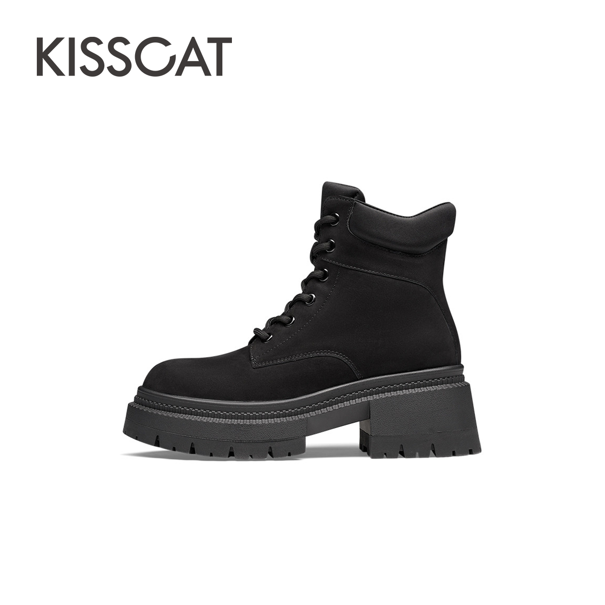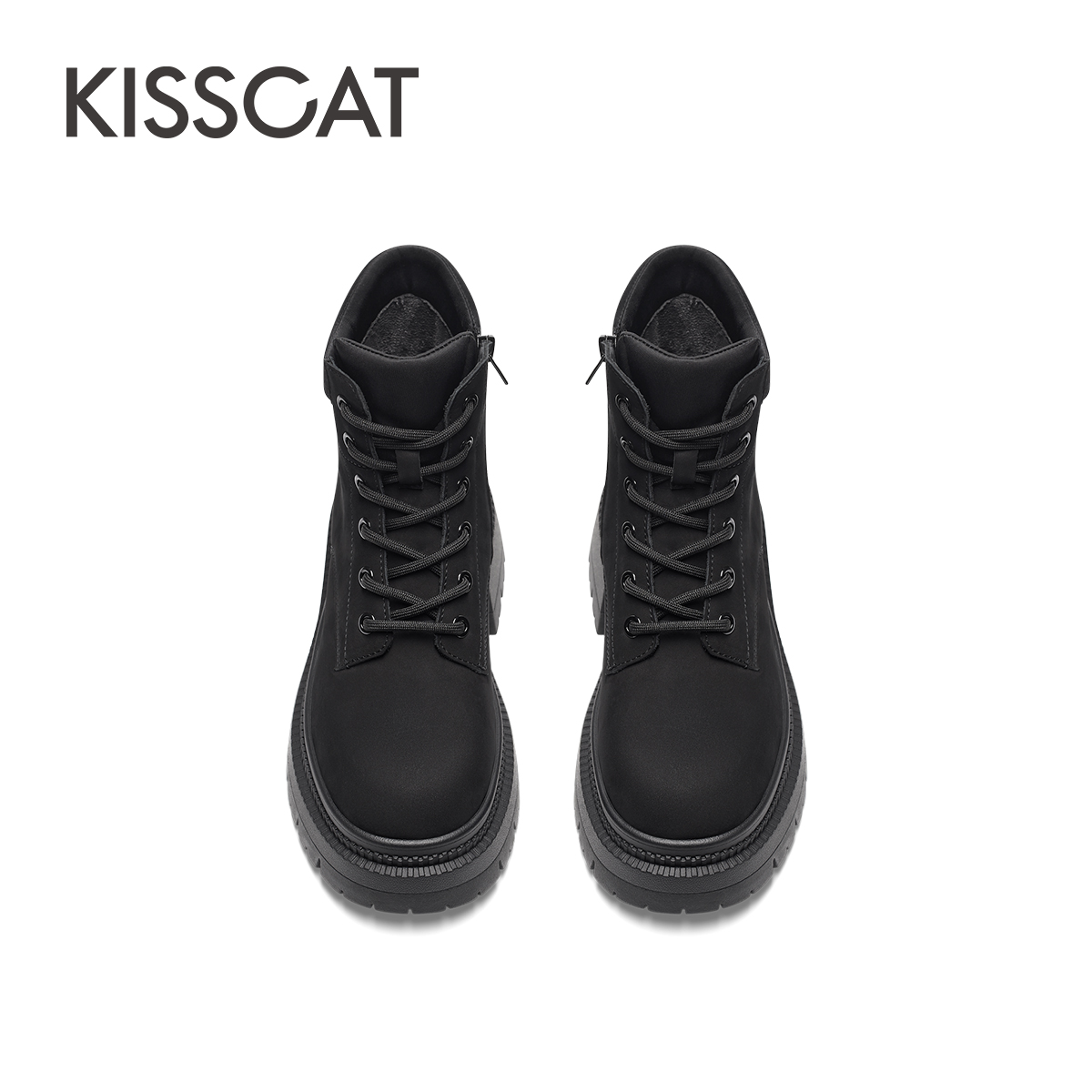 KISSCAT接吻猫黑色靴子厚底短靴户外大黄靴系带马丁靴女英伦风