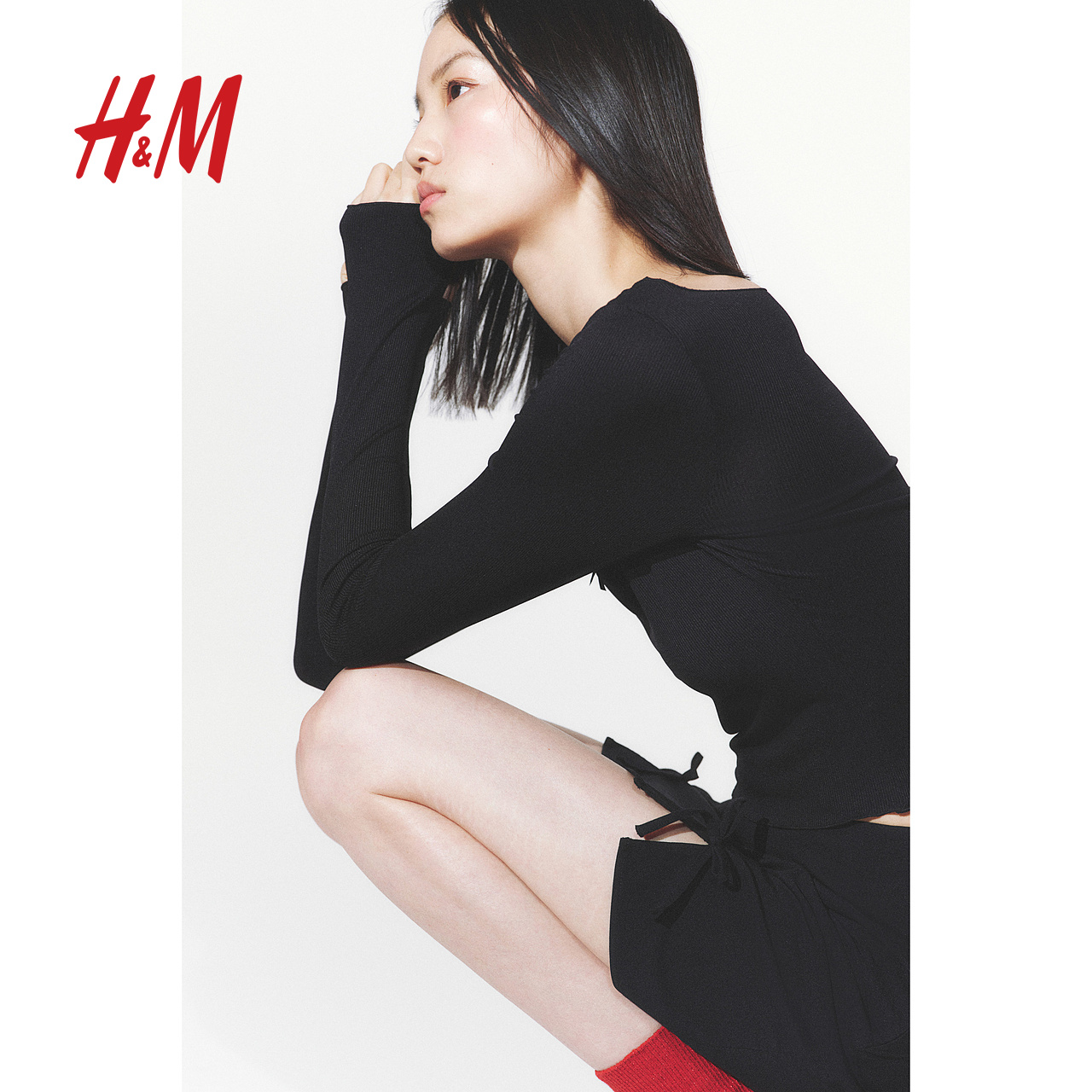 HM女装T恤2025年秋季新款圆领蝴蝶结打底衫内搭修身上衣1271124