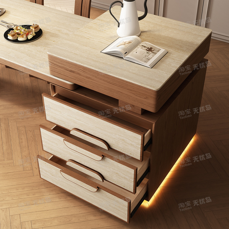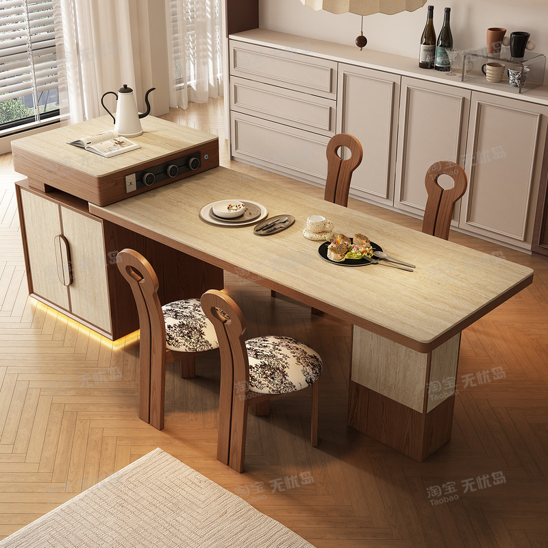 中古风岛台餐桌一体可伸缩家用小户型洞石岩板导台高级感厨房倒台