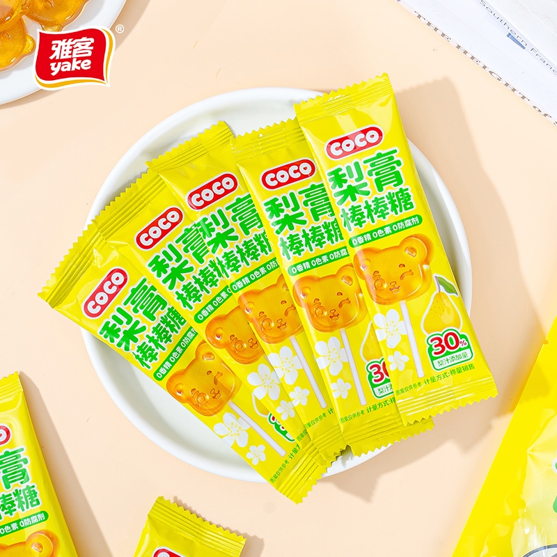 雅客COCO梨膏棒棒糖儿童硬糖润喉零食袋装糖果棒48g健康造型果汁