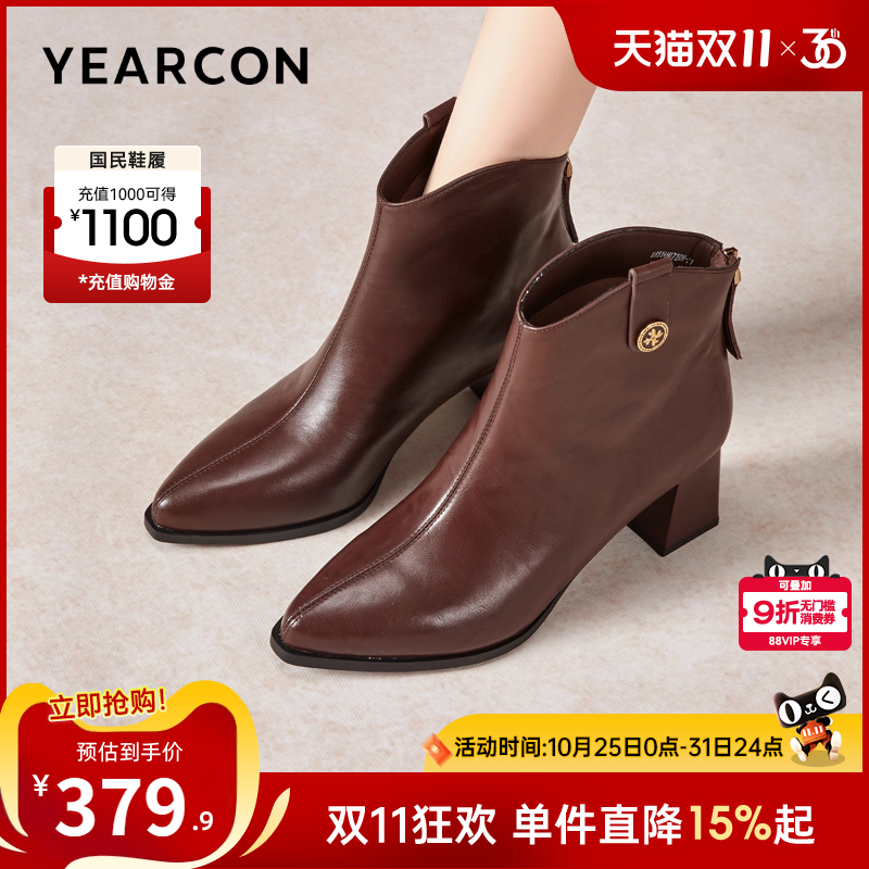 意尔康女鞋秋冬真皮短靴粗跟单靴气质英伦显瘦复古及踝靴女士皮鞋