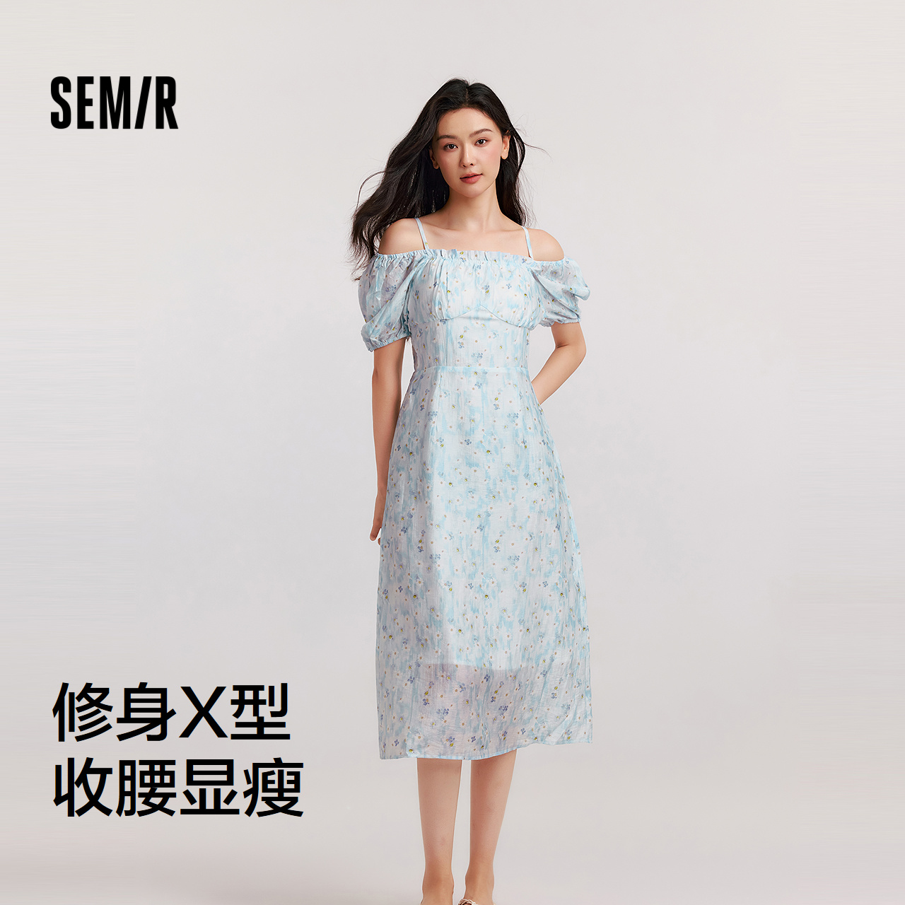 森马连衣裙女一字肩方领吊带修身长裙温柔夏浪漫肌理碎花裙小清新