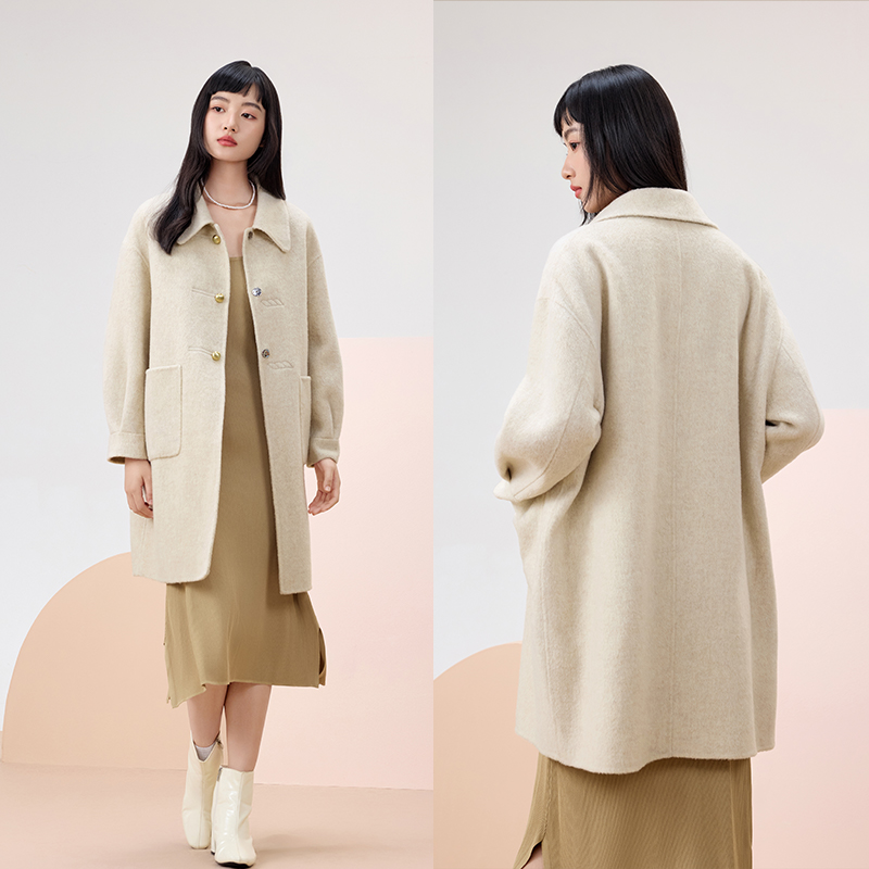 爱居兔全羊毛双面呢大衣女冬季新款温柔米色时尚中长款外套