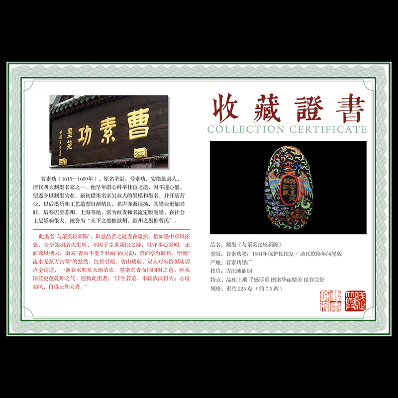 国家非遗 1984年制 清代乾隆老墨版《与茶奚》曹素功收藏墨条 徽墨艺术礼品 精品油烟墨条高档墨锭文房四宝