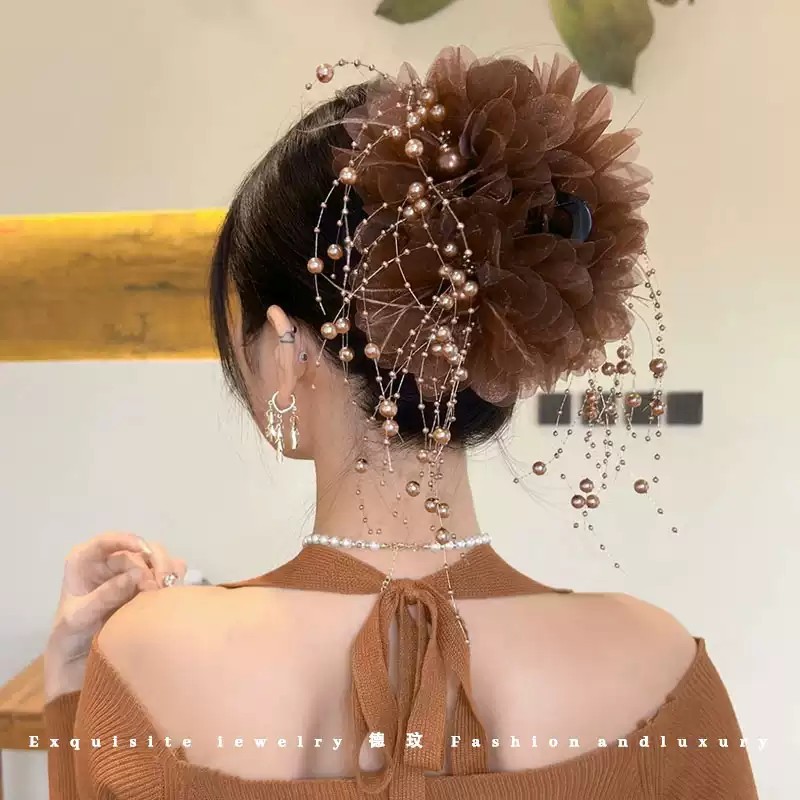 牡丹花羽毛流苏抓夹女新款发夹后脑勺显发量蓬松高颅顶鲨鱼夹发饰