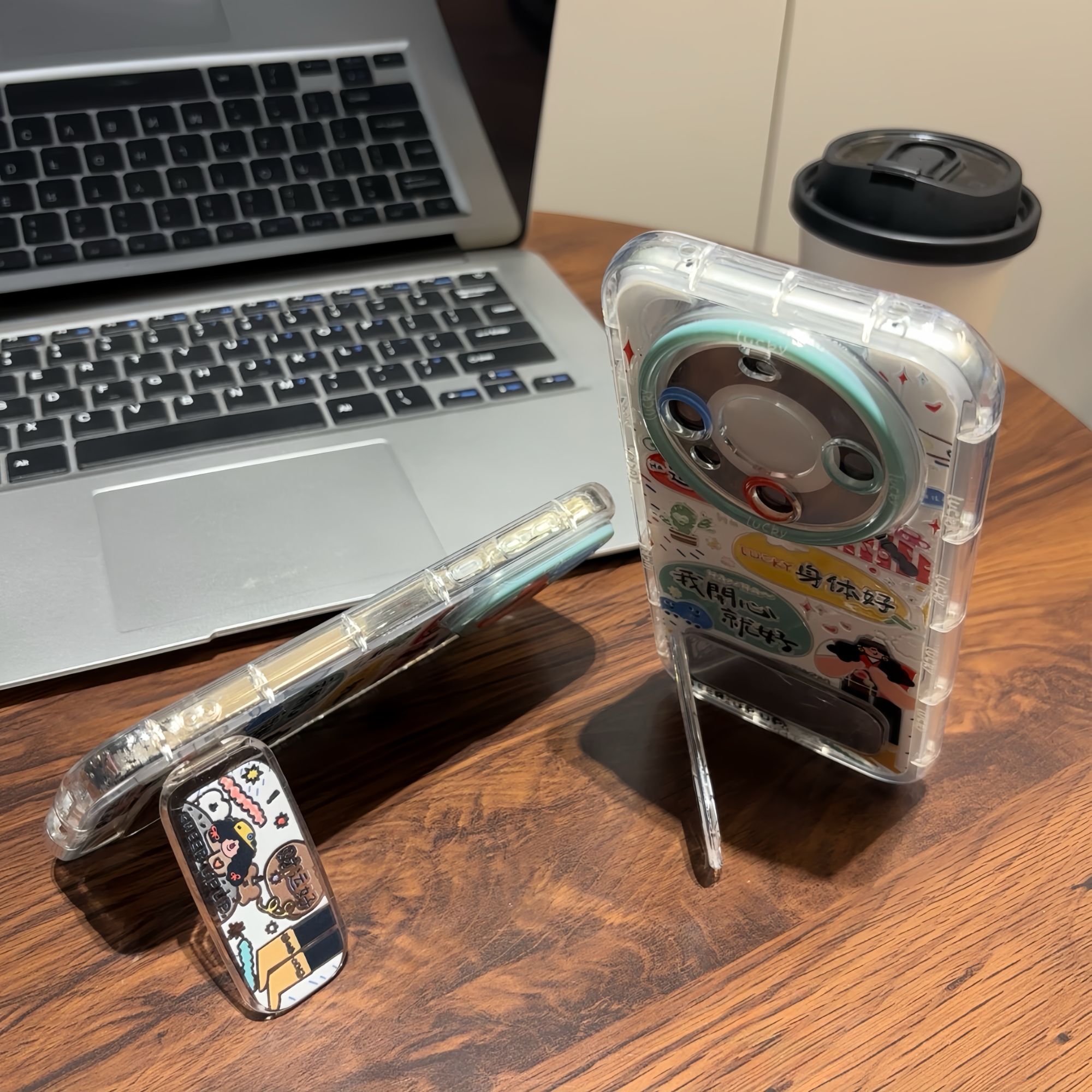 涂鸦ins我开心就好身体好羽纱镜面支架适用iPhone16promax苹果15手机壳新款华为mate70荣耀vivo小米OPPO防摔