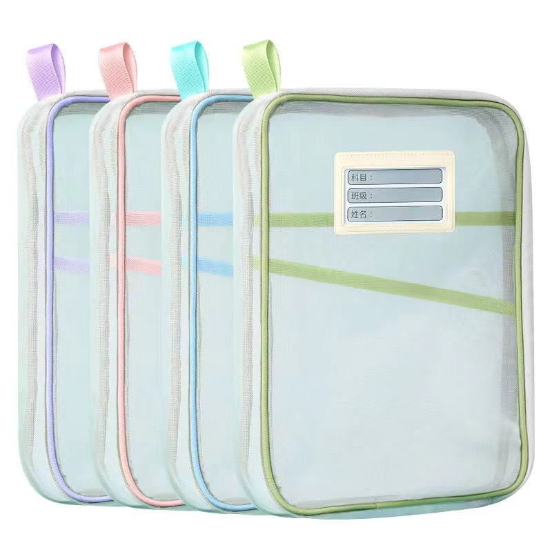 L型透明网纱拉链式文件袋试卷袋大开口拎书袋手提袋透明补习袋