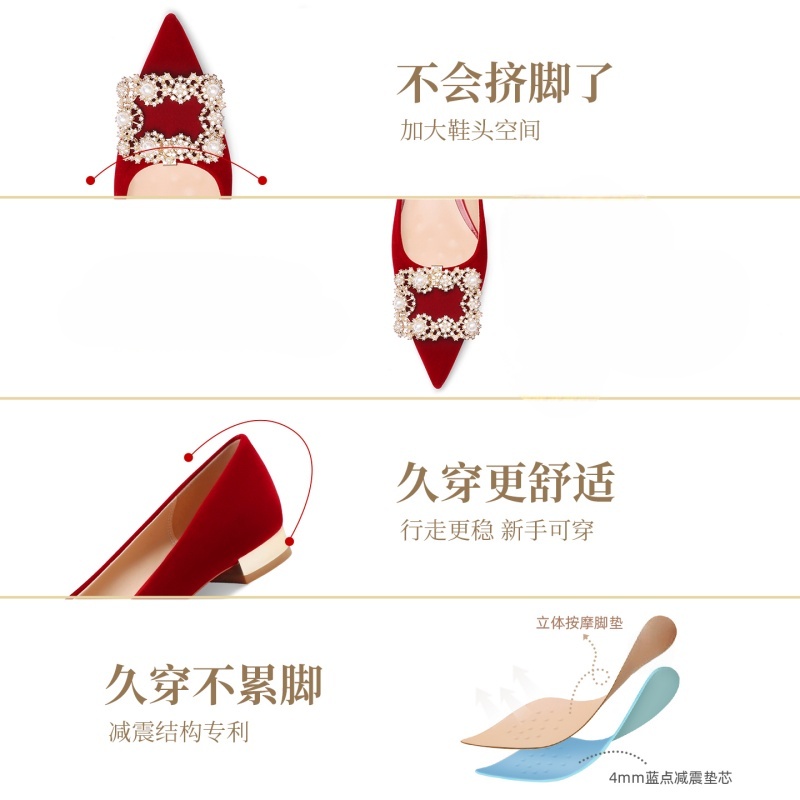 绝美珍珠方扣婚鞋女主秀禾婚纱两穿新娘鞋不累脚低跟单鞋粗跟尖头