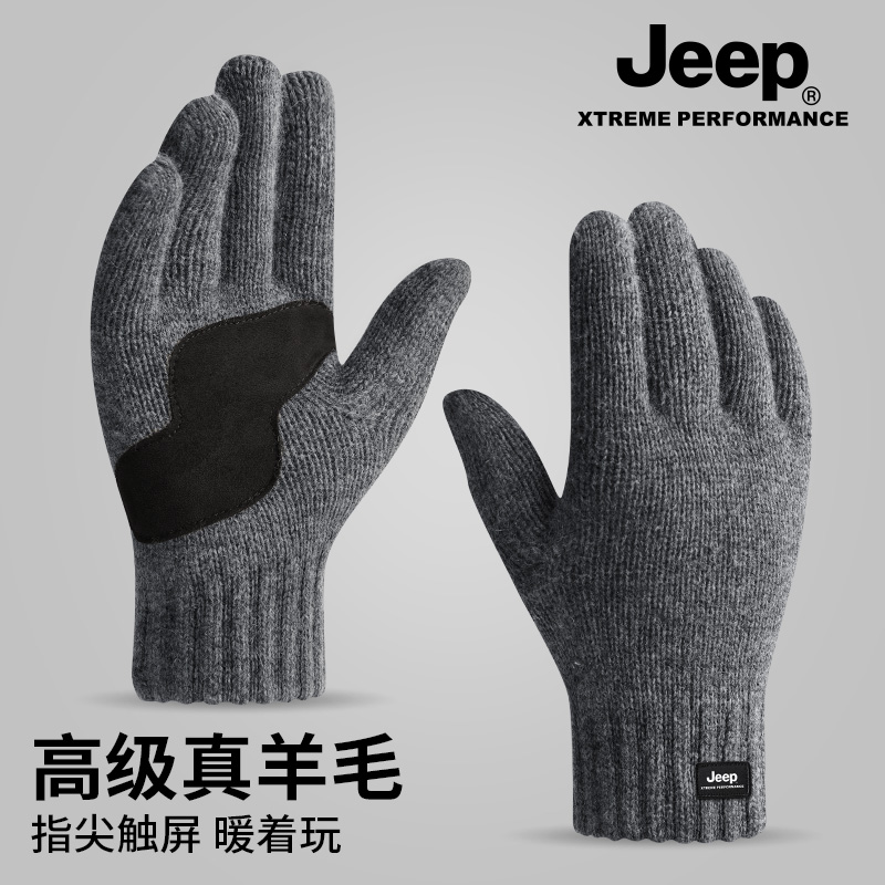 jeep吉普男士冬季羊毛混纺针织手套加绒加厚保暖防寒可触屏手套男