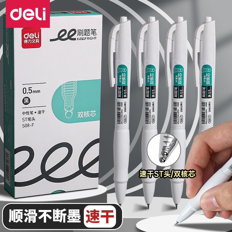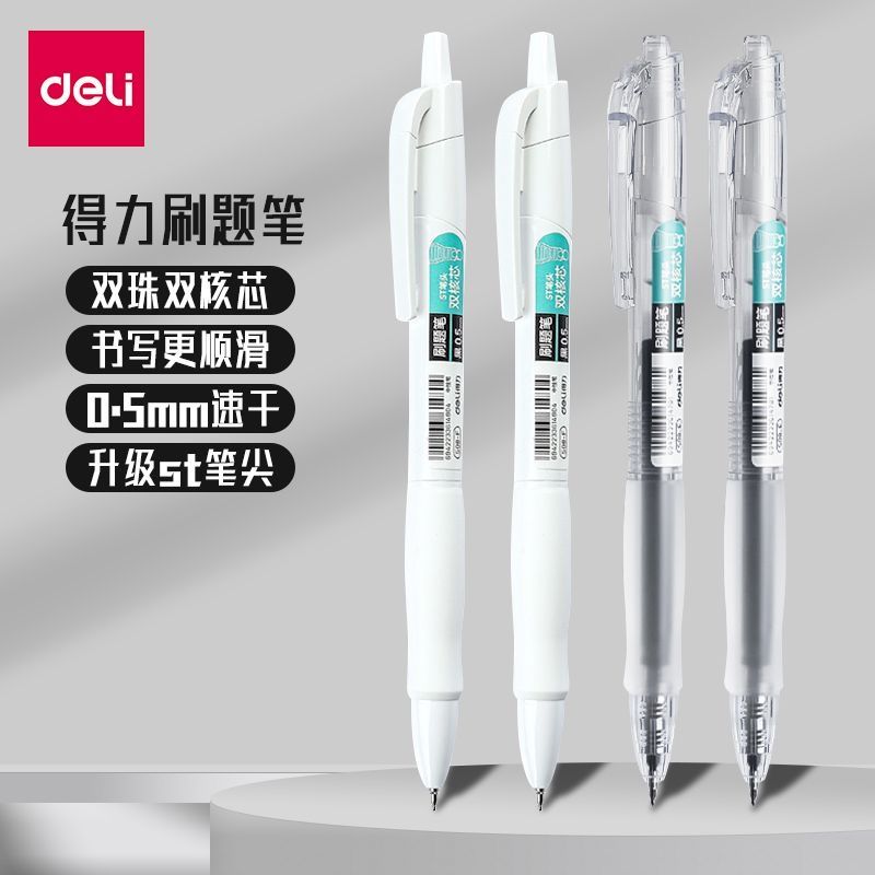 得力按动中性笔高颜值双珠ST头学生ins刷题笔0.5速干好写黑色水笔