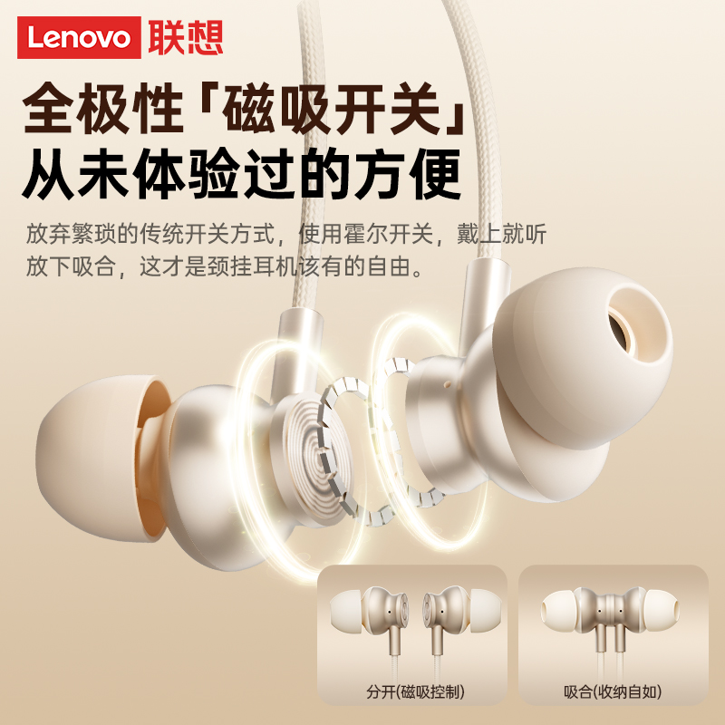 联想E500颈挂脖入耳式蓝牙耳机无线跑步运动降噪久戴不痛2025新款
