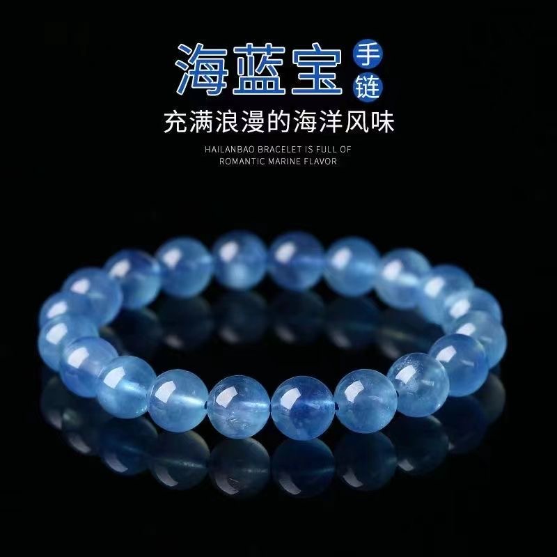 收藏级冰种海蓝宝石手链巴西冰种蓝水晶珠子手串女海宝蓝单圈手串