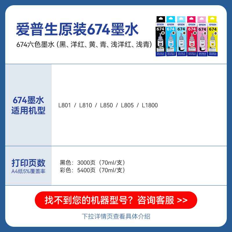EPSON爱普生T674原装墨水 L805 L1800 L850 L810 L801六色喷墨打印机连供墨水墨汁T6741 6色 原装正品爱普森
