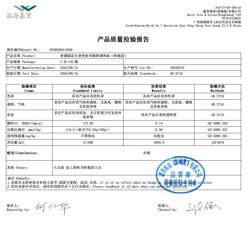 【工厂直销】香满园花生香调和油1.8L/瓶家用商用批发优惠食用油