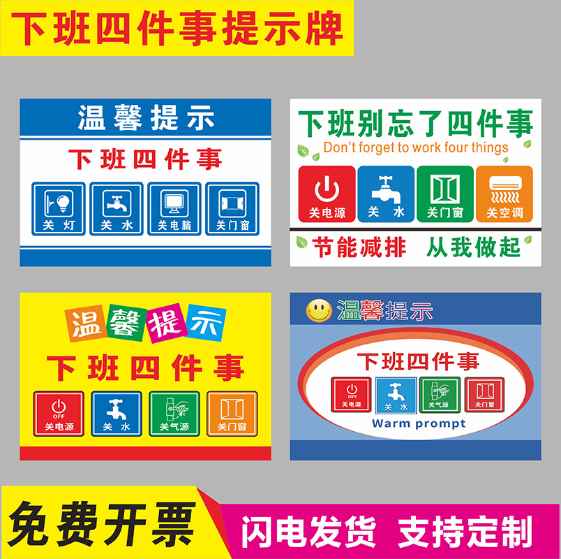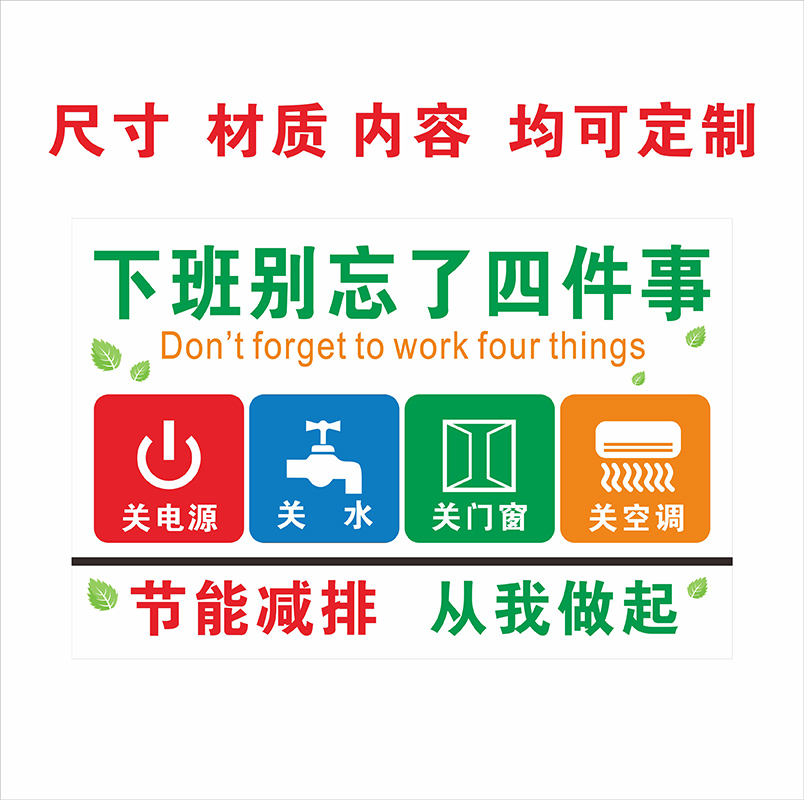 工厂下班四件事温馨提示节约水电及时关灯节约用水下单打卡定制标识牌随手关灯电器随手关门自带背胶PVC材质