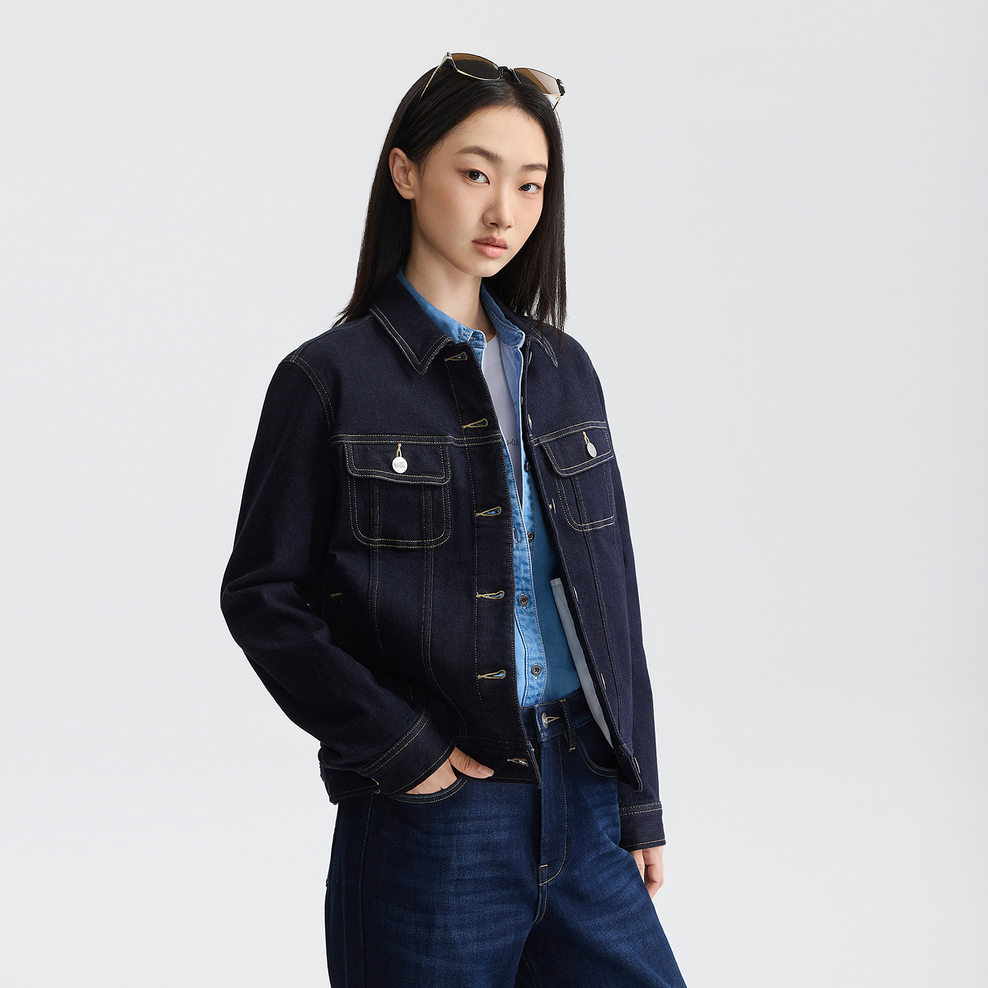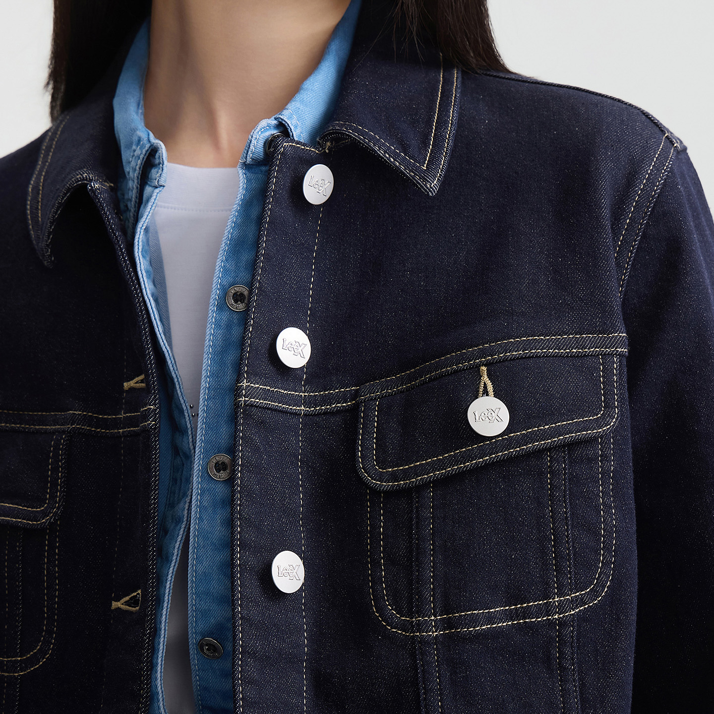 Lee25秋冬新品标准版翻领不易褪色深蓝色磨毛女牛仔夹克外套保暖