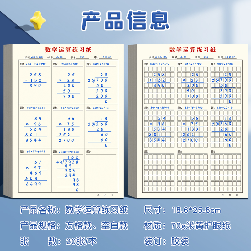 数学运算练习纸小学生专用数位对齐演算演草纸乘除法书写竖式计算本草稿纸初中生高中生空白方格分区草稿本b5
