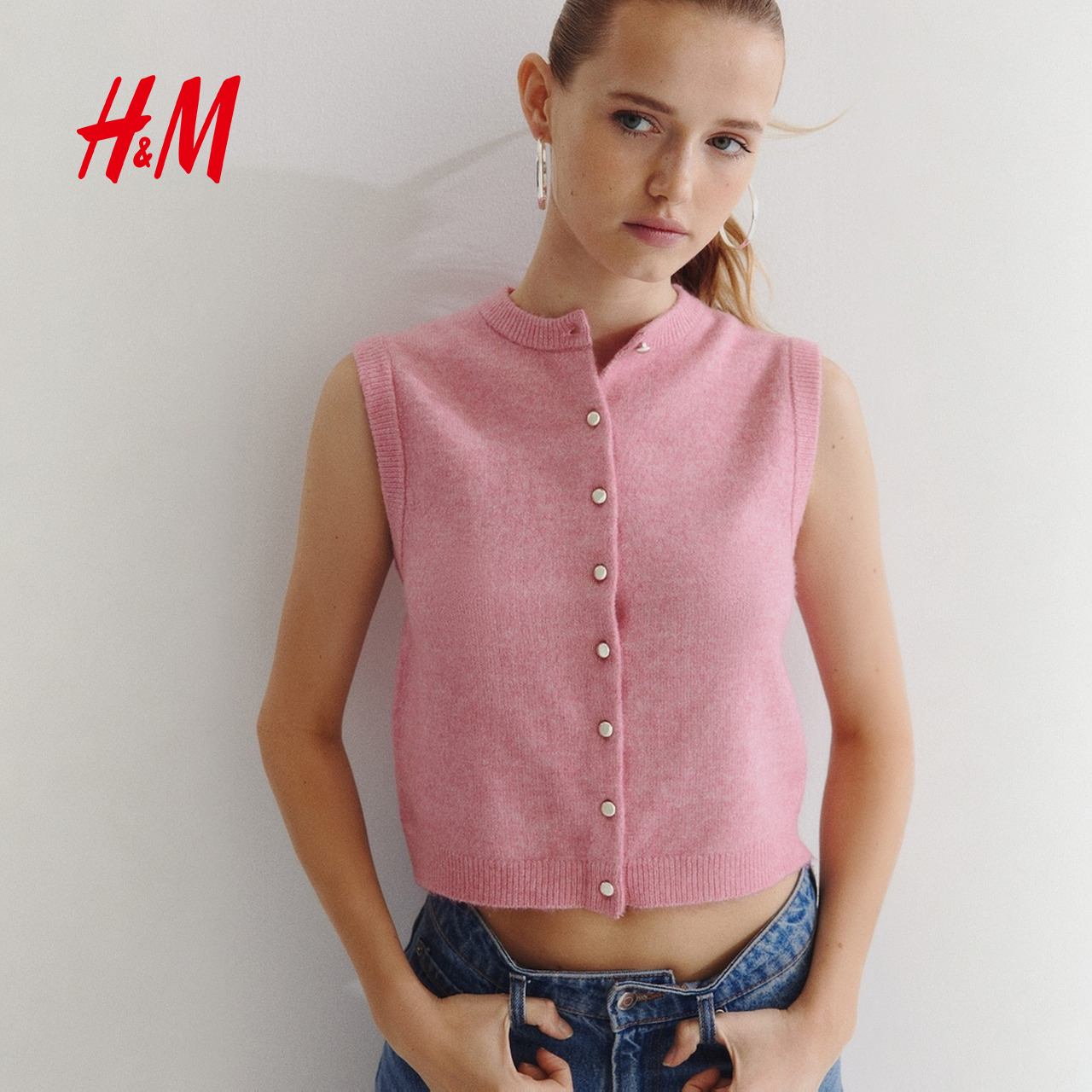 HM女装毛针织衫2025秋季新款文艺圆领单排扣无袖背心开衫1296848
