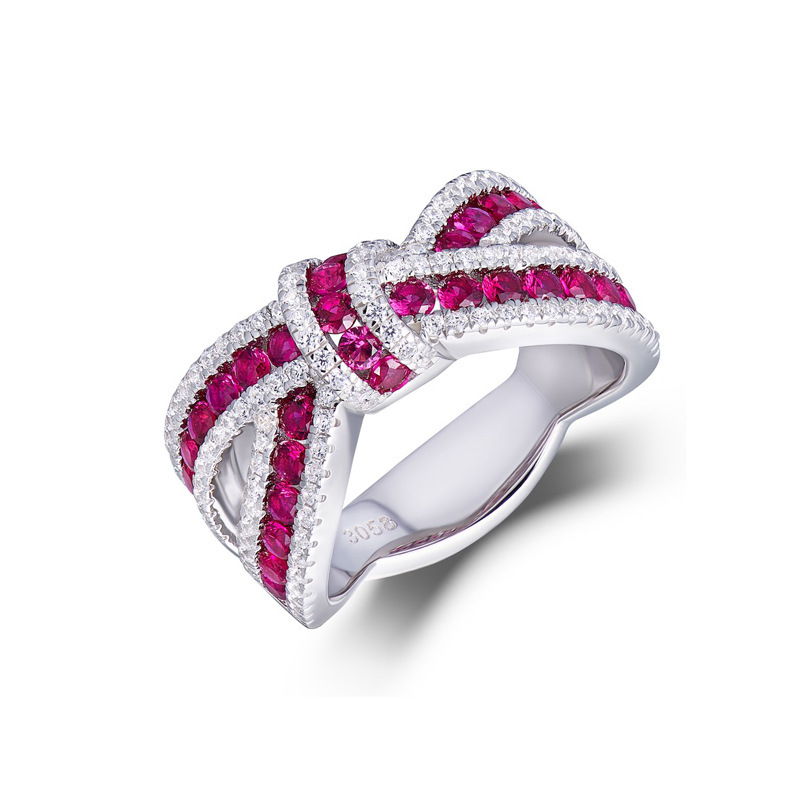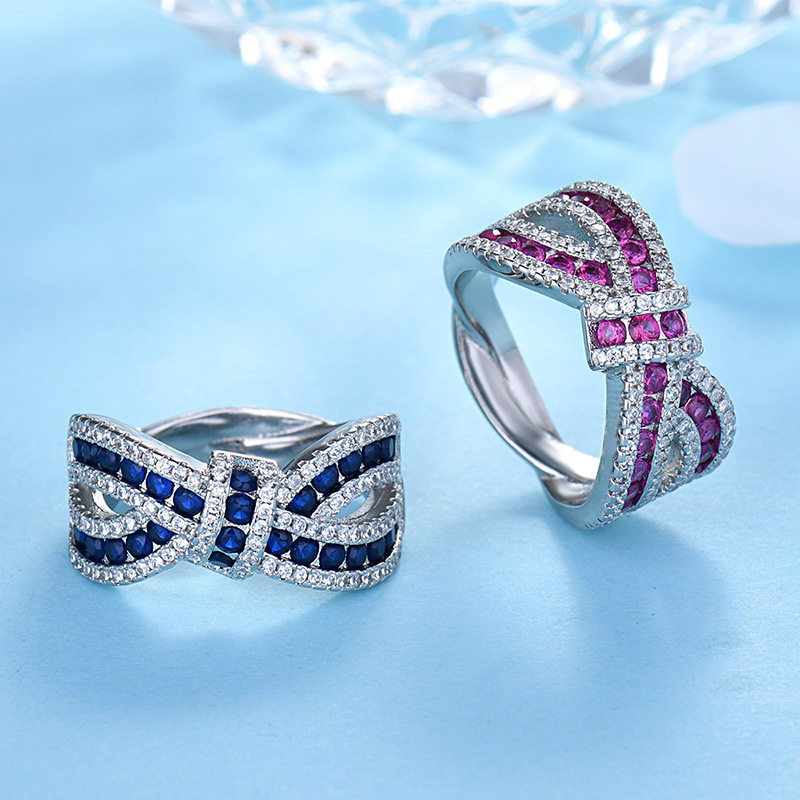 韩版蝴蝶结钻戒女s925银镶嵌红宝石不规则条形交叉戒指丝带指环