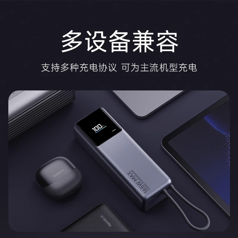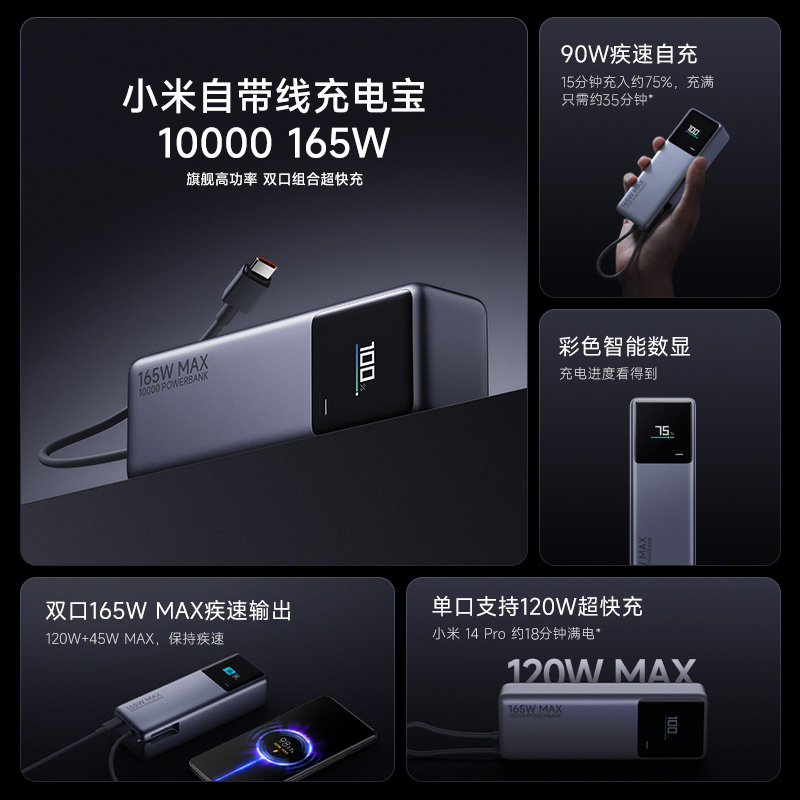 小米自带线充电宝10000 165W大功率双口超快充单口120W大容量