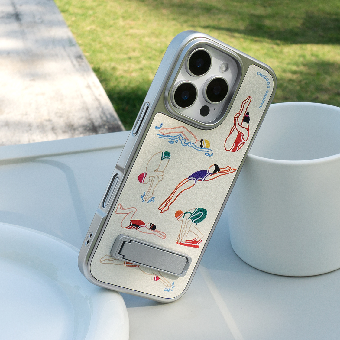 casegood原创荔枝纹皮质跳水插画隐藏式一体支架手机壳17新款13苹果16pro适用15promax保护套14小众创意