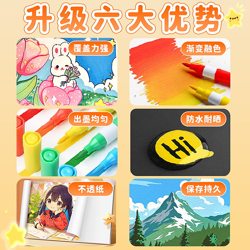 直液式丙烯马克笔小学生美术专用水彩笔儿童无毒可水洗不透色可叠色幼儿园画笔48色绘画24彩色笔炳稀笔芯软头