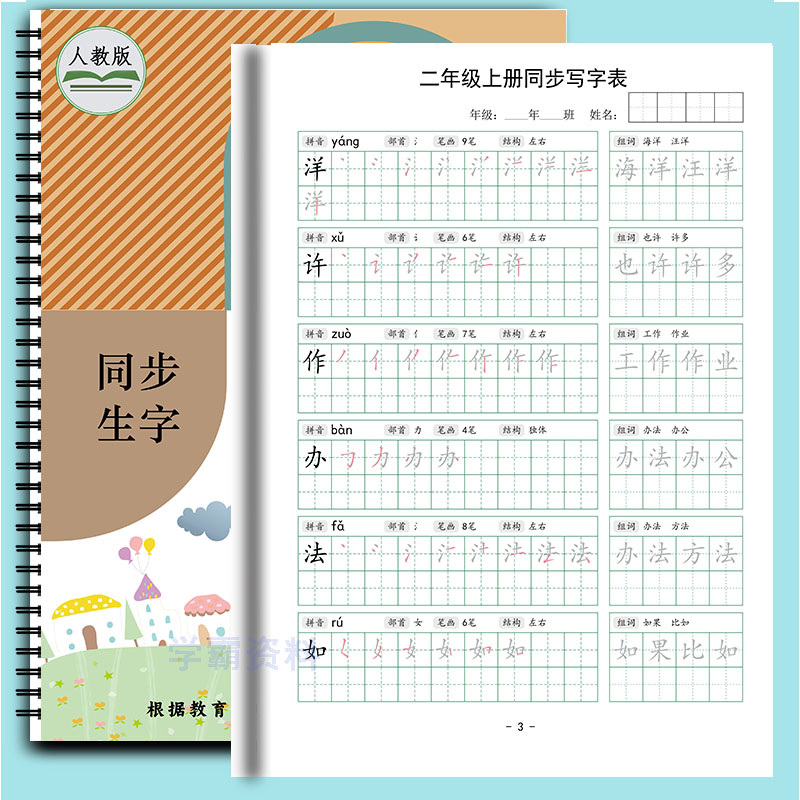 人教版小学1-6生字专用拼音部首笔画笔顺结构组词描红同步练字贴