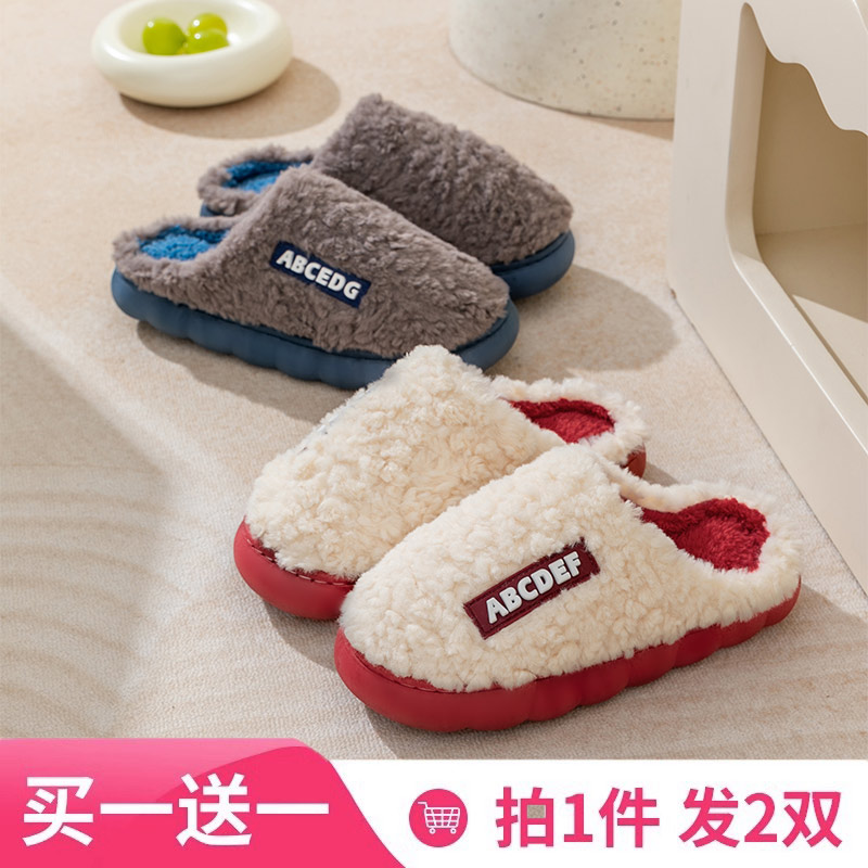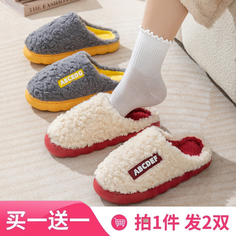 买一送一棉拖鞋女秋冬季情侣一对厚底防滑保暖毛绒居家室内棉拖男