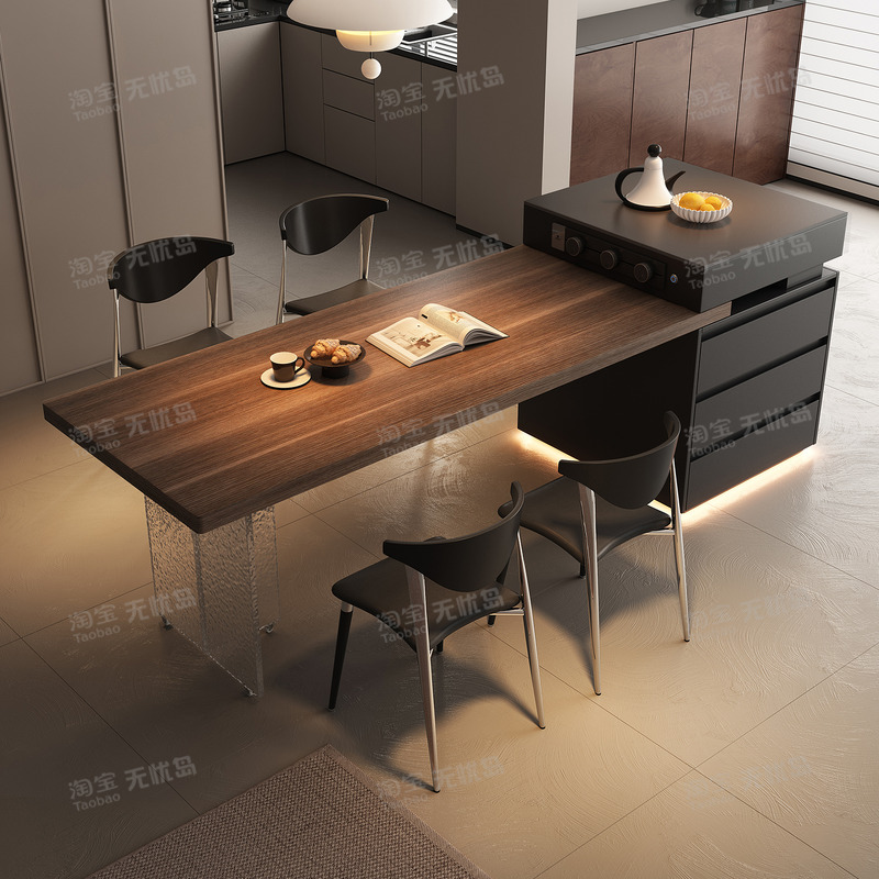 意式极简胡桃木纹岩板可伸缩岛台餐桌一体家用带泡茶多功能中导台
